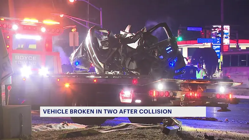 Car splits in half after striking utility pole on Route 9 in Manalapan
