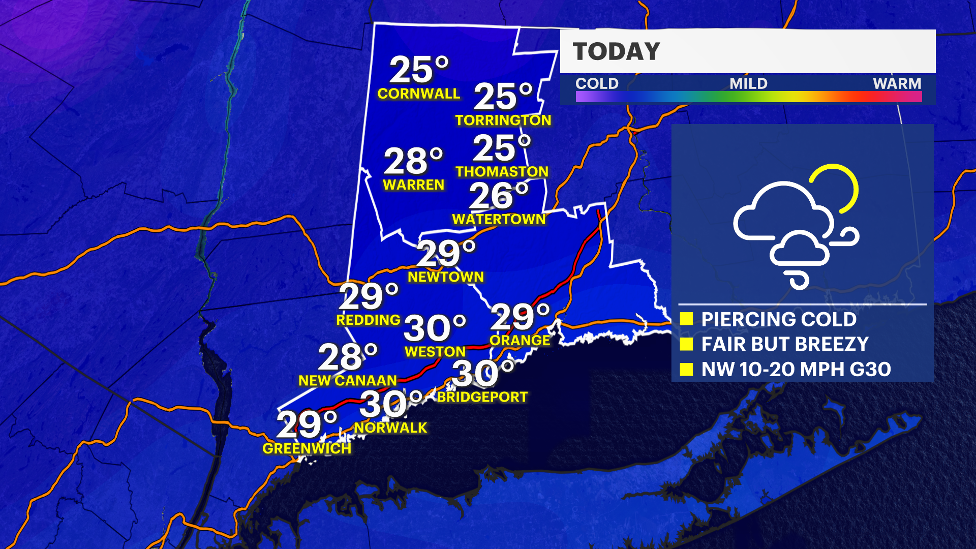 Today: Increasing clouds and bitterly cold. Afternoon temperatures only reach the upper 20s to near 30, with wind chills staying in the single digits to teens. Winds remain brisk out of the west.