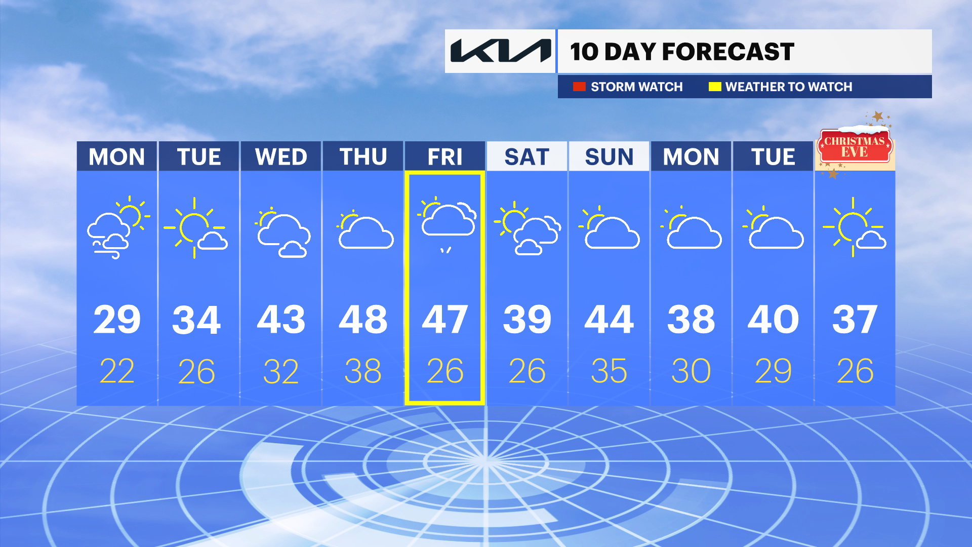 Sunday: Mostly cloudy with another chance for rain. Highs rebound into the mid to upper 40s.