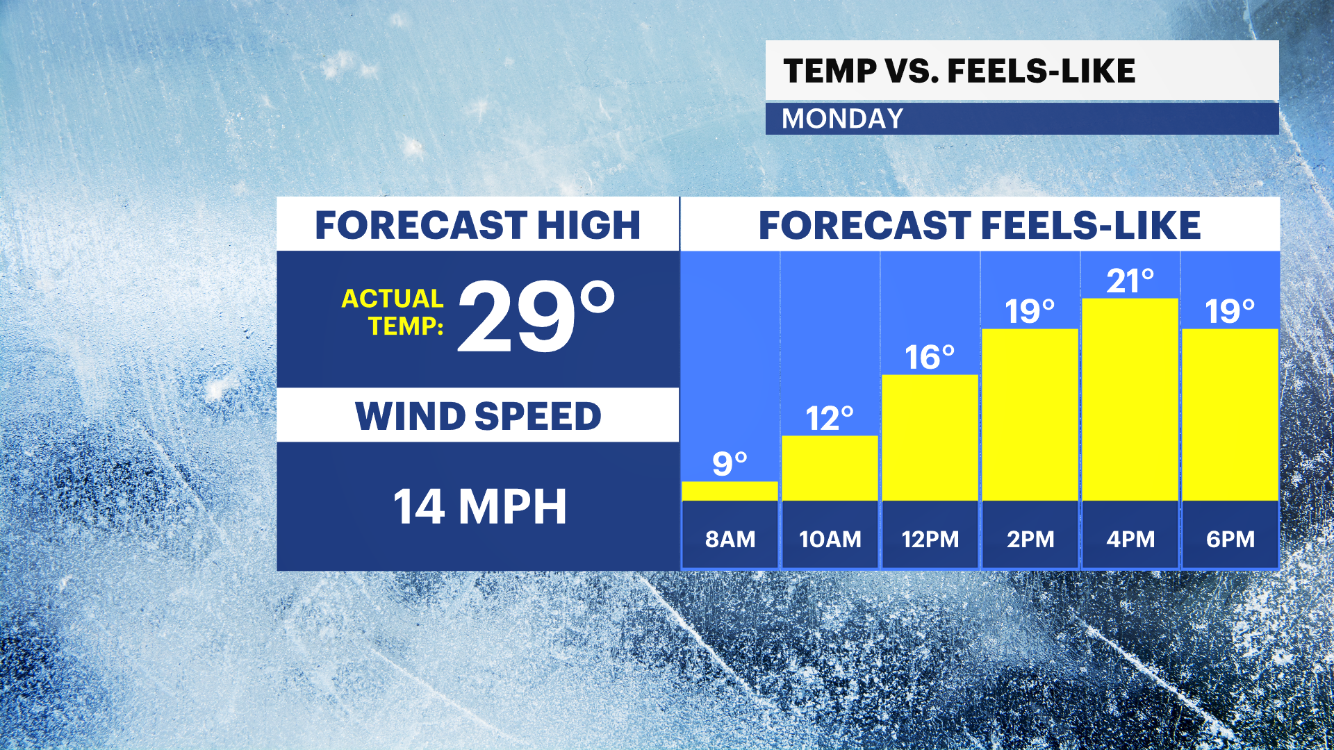 After 3-5 inches of snow on Sunday, it is a cold and blustery start to the week as Arctic air settles in today and for Tuesday as well. Wind chills will make it feel especially harsh, with the coldest conditions this morning with a below zero feel outside because of the gusty winds up to 30 mph. Areas of black ice are possible today and tonight as any standing water is now frozen, watch your step!