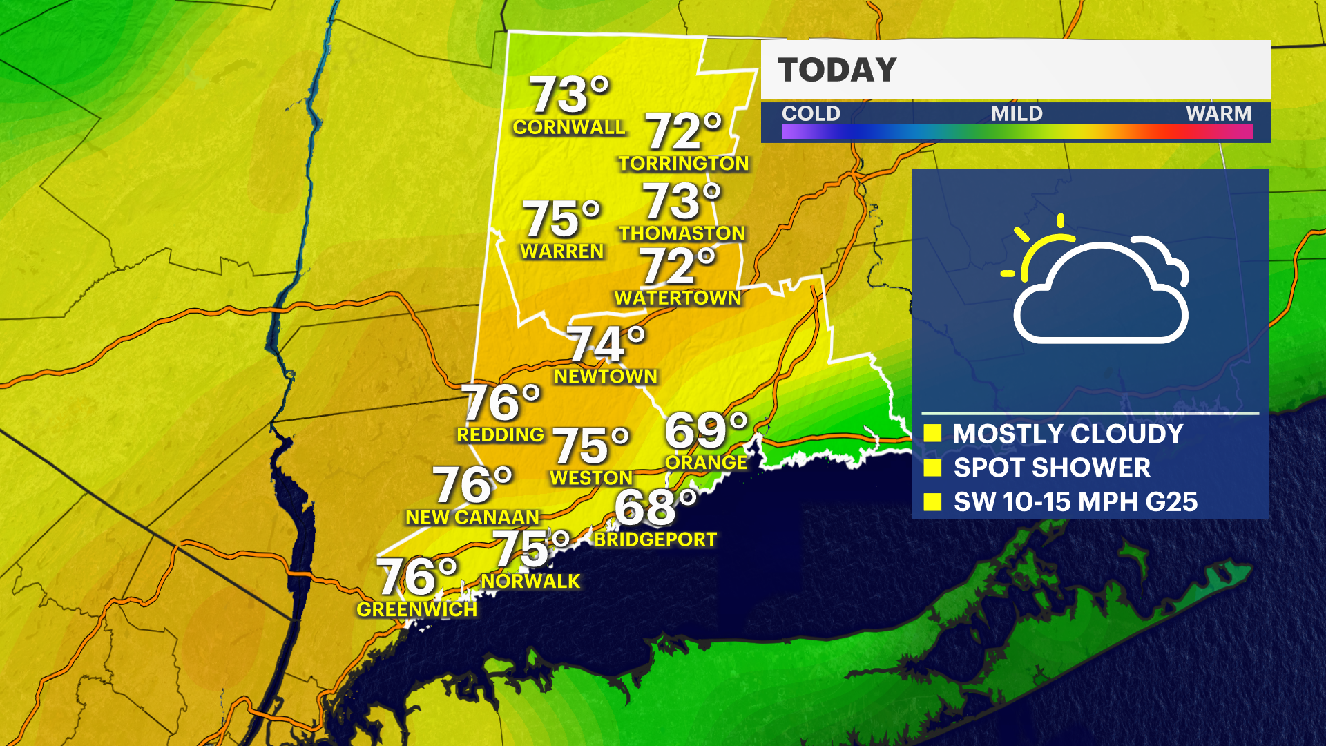 MONDAY: Mostly cloudy, with a chance of spotty to scattered showers. Highs in the low 70s. Lows in the upper 50s.