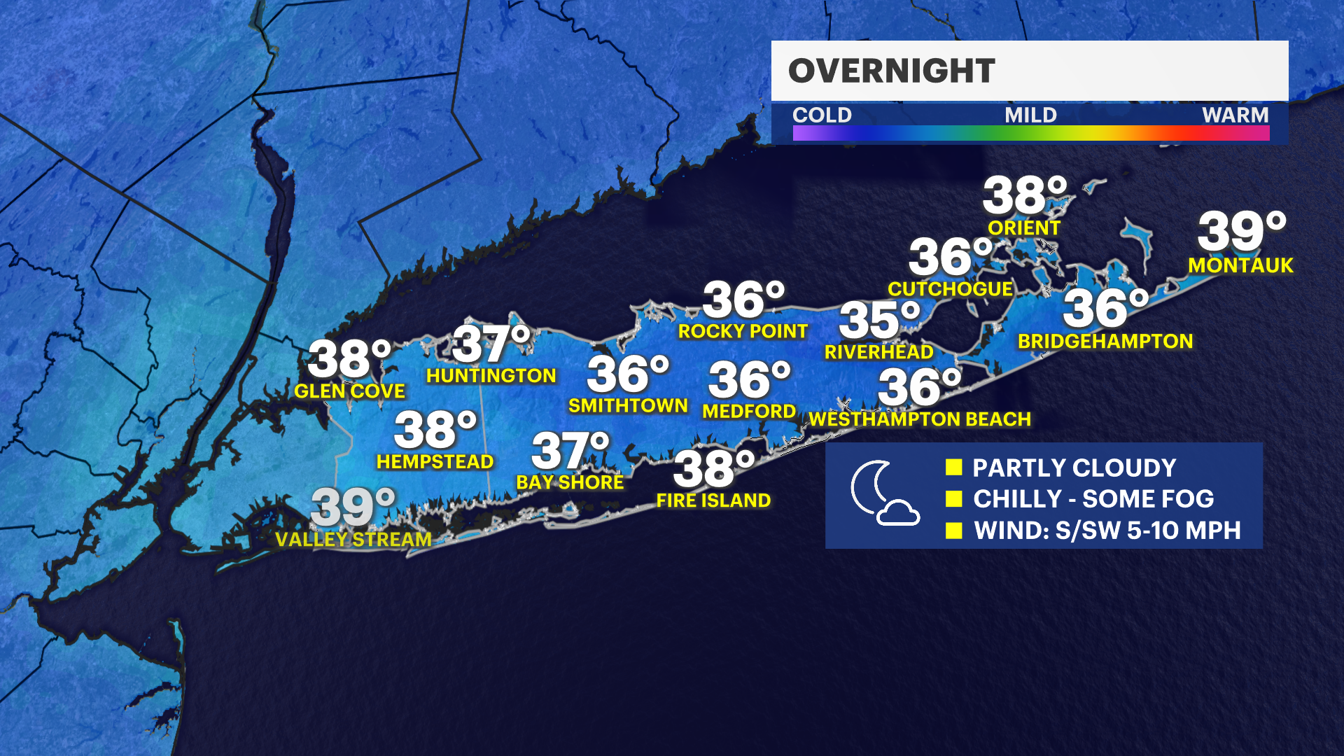 This afternoon (Elevated Fire Danger): Long Island will see milder temperatures and dry weather, a welcome change from the recent chill. Expect a mix of sun and clouds, with a light breeze turning onshore this afternoon. That ocean wind will keep coastal areas a bit cooler than inland spots, but overall it will feel noticeably warmer. However, the dry air and dry vegetation will also create an elevated risk for fire spread, so use caution with anything that could start a fire. Please observe the State Burn Ban.