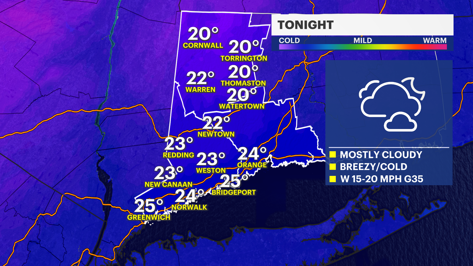 TONIGHT: Partly to mostly cloudy. Breezy and cold. Low of 25.