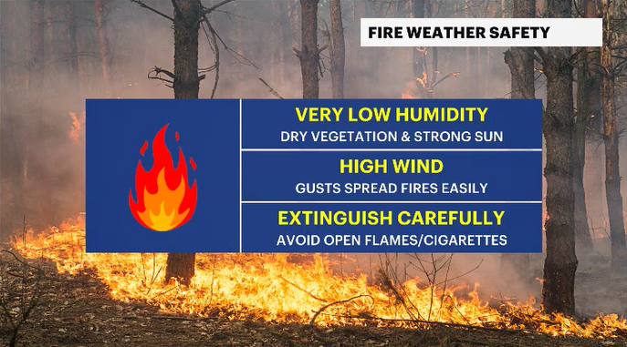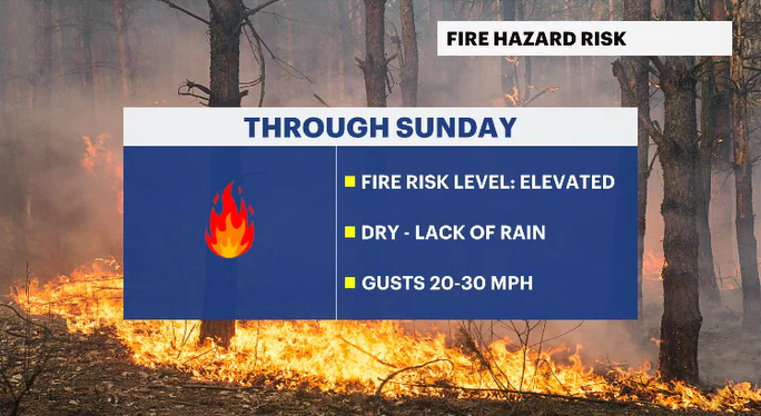 Gusty northwest winds between 25 and 30 mph combined with low relative humidity near 30 percent, will create favorable conditions for fires to ignite and spread. Dry vegetation and limited recent rainfall will increase the risk. Outdoor burning is discouraged, and residents should use caution with any open flames. The winds will shift on Sunday, blowing from the south, but still reach gusts around 20 mph in the afternoon.