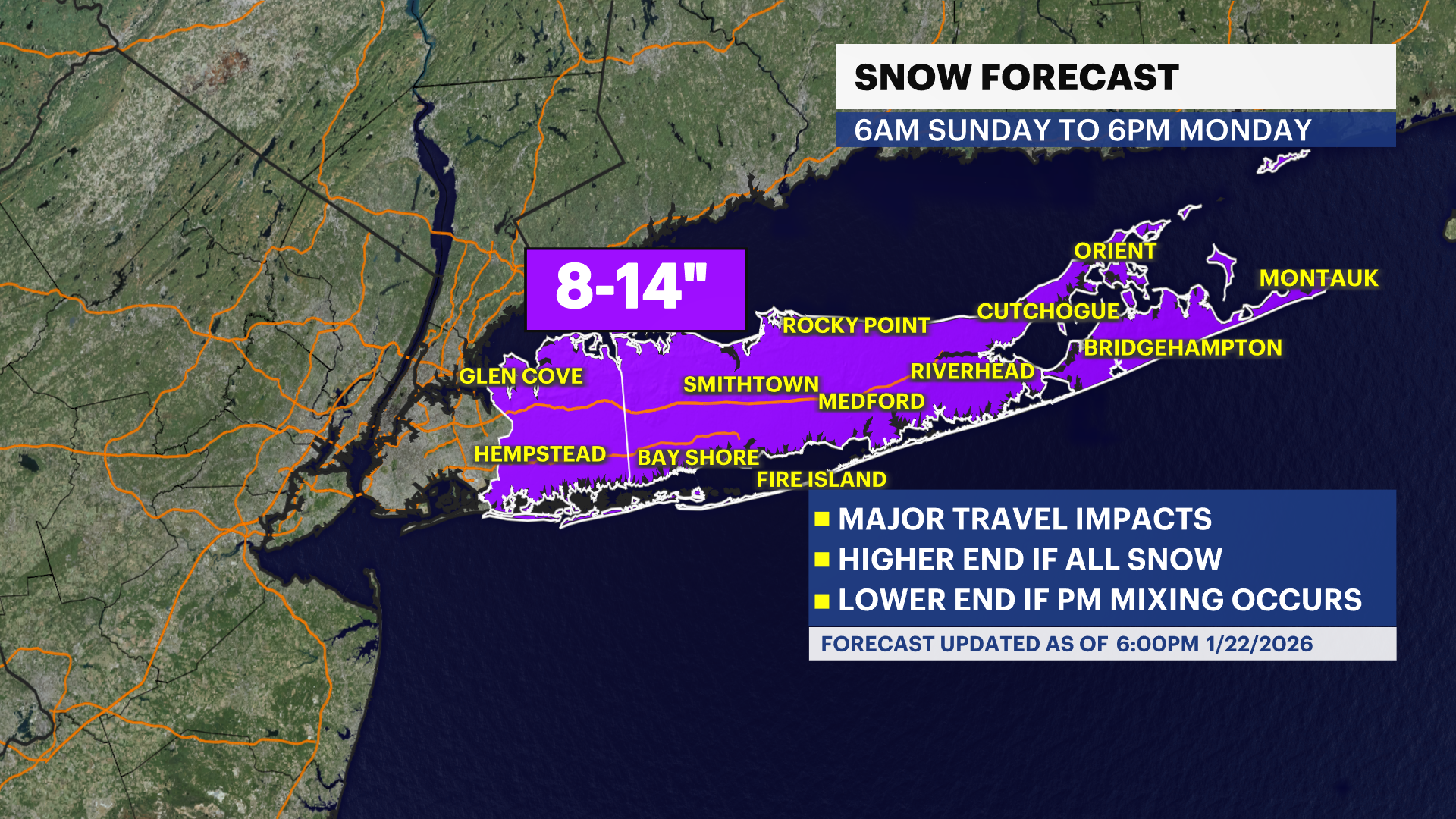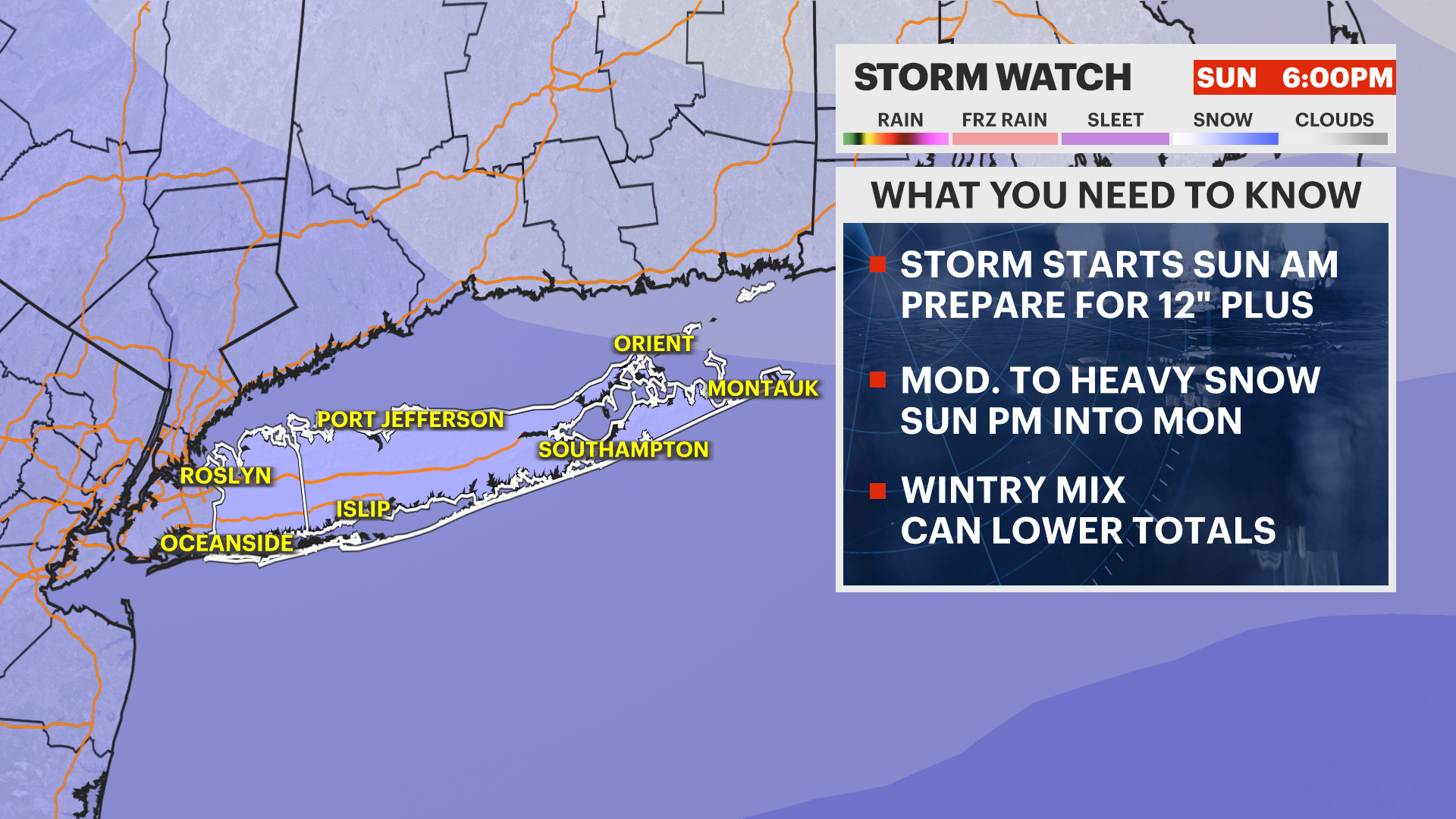 WHAT DO WE KNOW? A major winter storm will be impacting Long Island, starting after around 6 a.m. Sunday. Snow will stick immediately and pick up in intensity through the day. This will cause dangerous travel by mid-morning on Sunday.