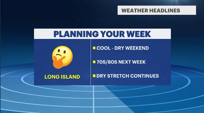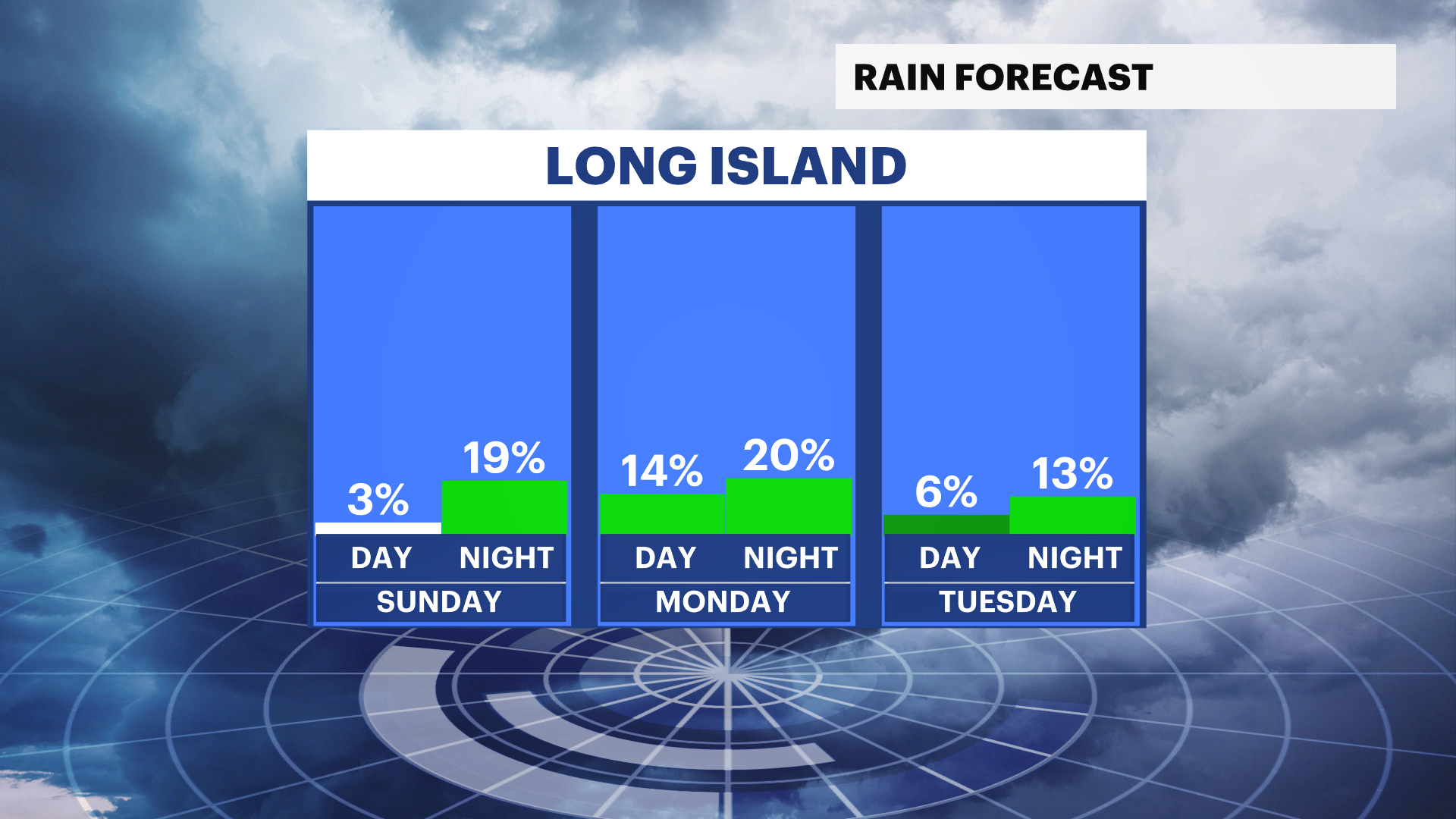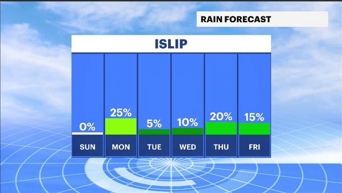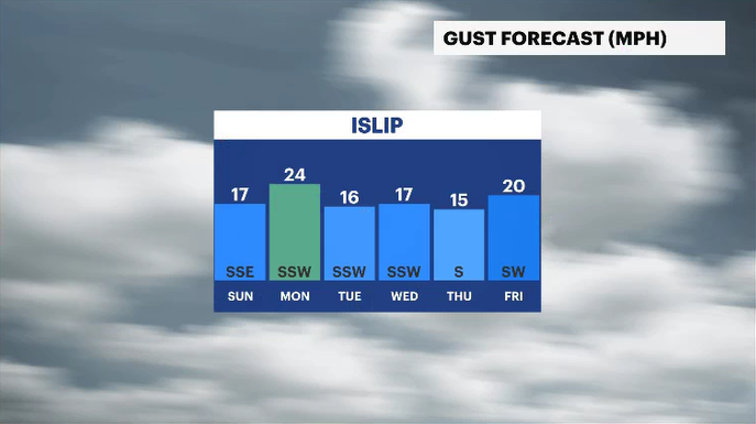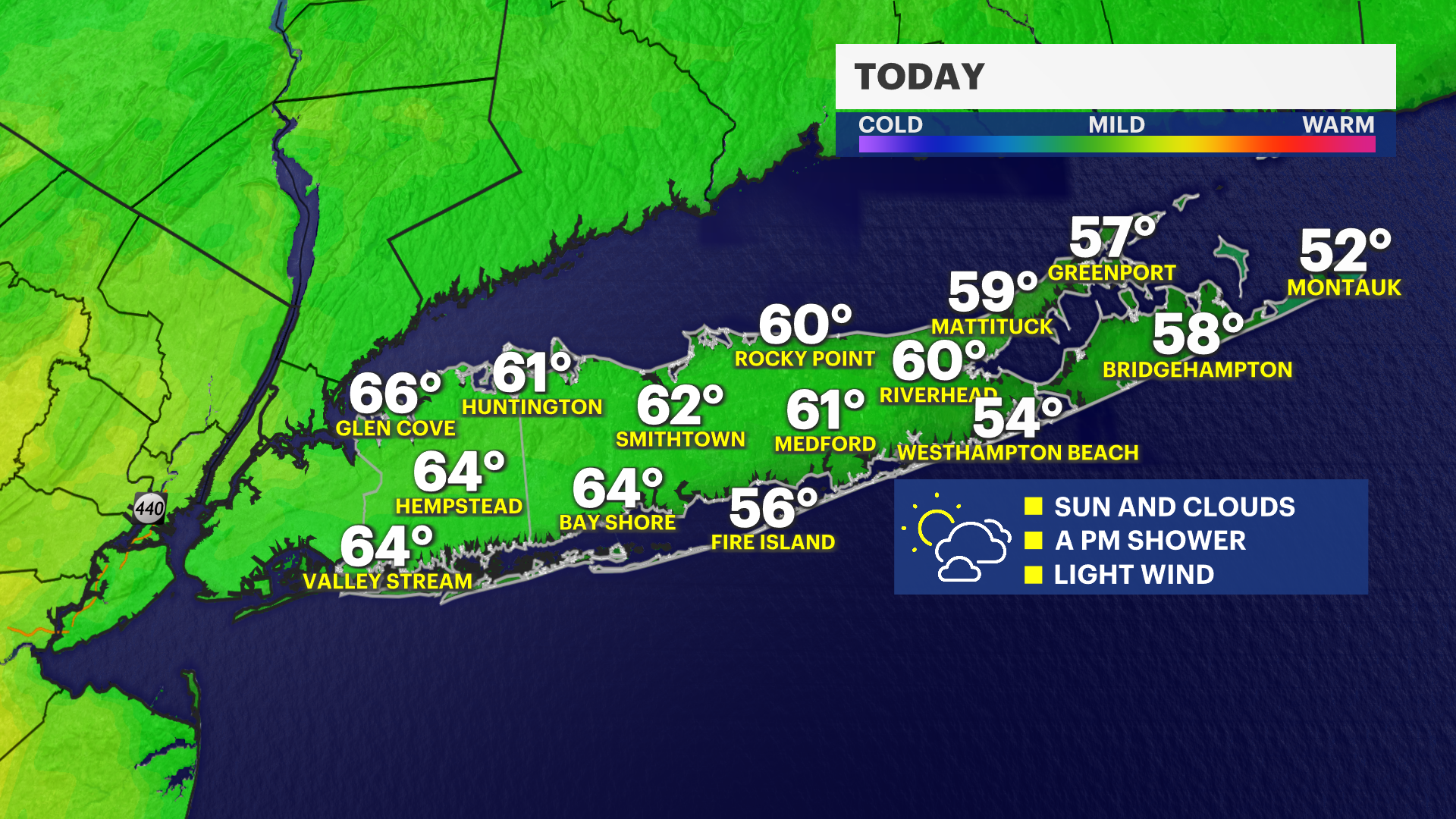 By Wednesday, inland parts of Long Island could reach the 70s, while coastal areas remain a few degrees cooler. A cold front may bring scattered showers and thunderstorms late Wednesday into early Thursday.