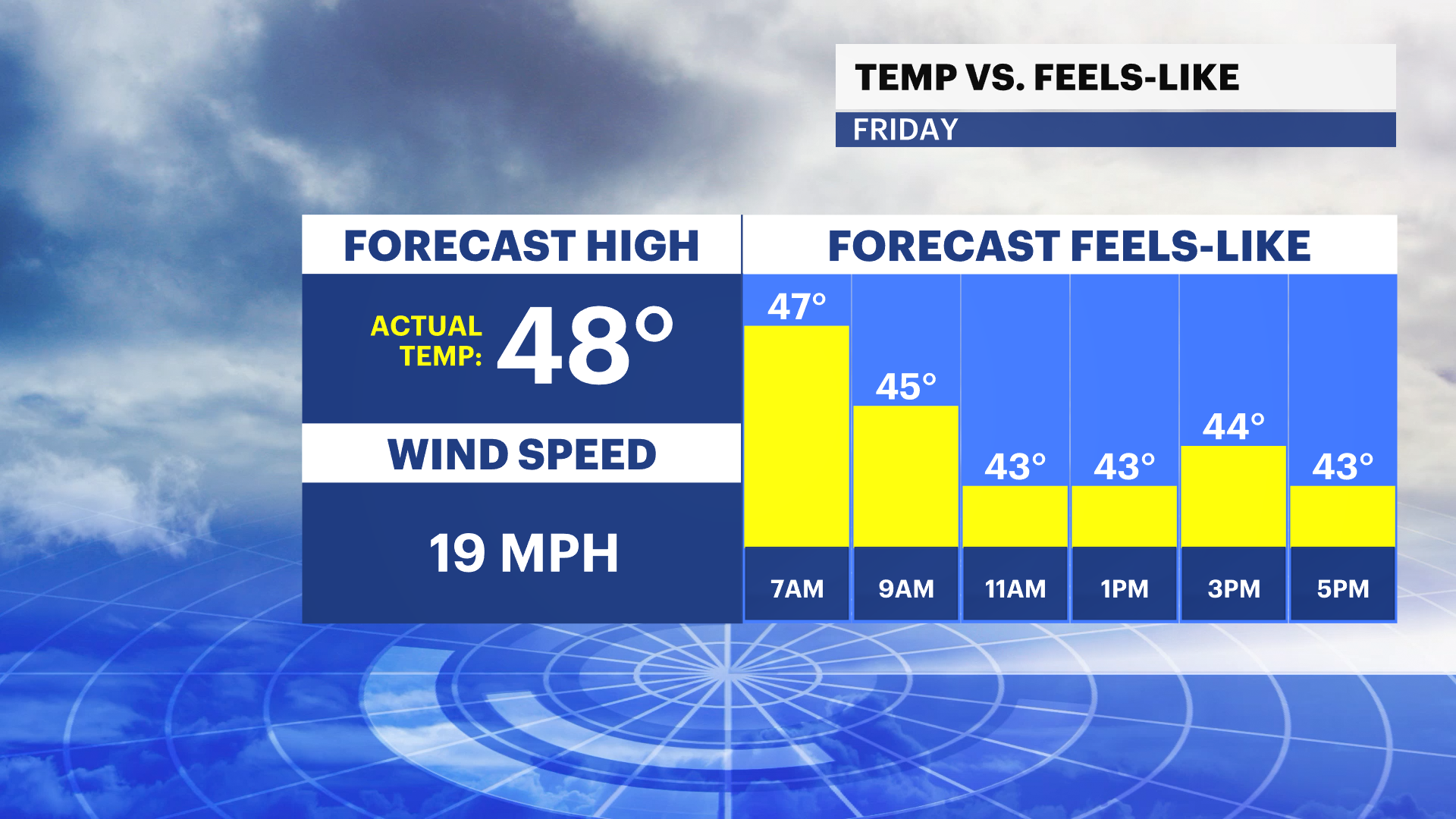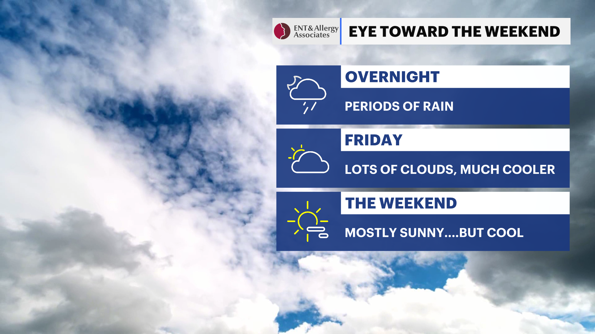 Clouds will linger early in the morning, especially out east, but most of the day will turn drier. There could be some breaks of sun but clouds should dominate. Temperatures will be noticeably cooler than today, settling into the low 50s, which is closer to what we normally expect this time of year.