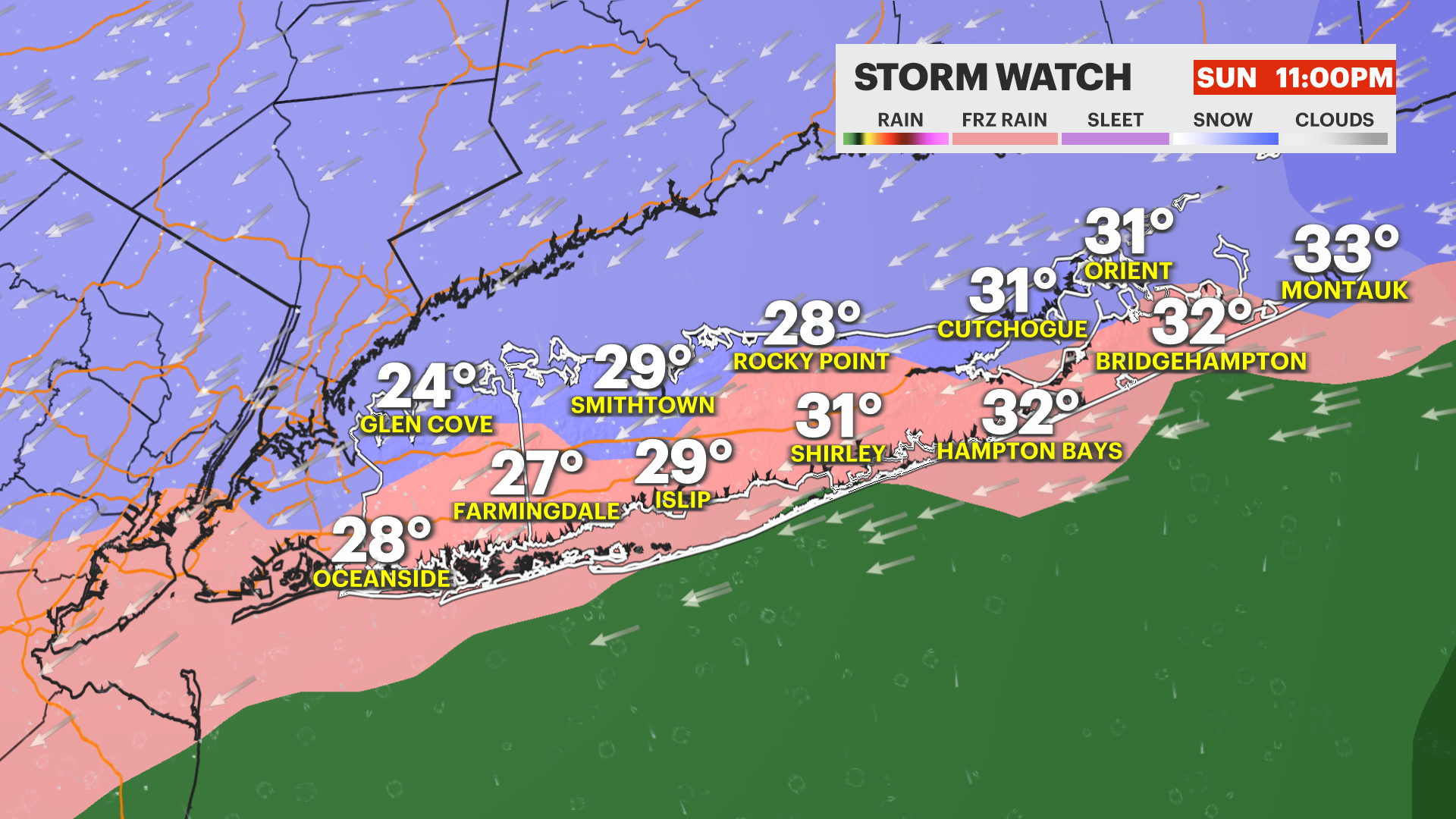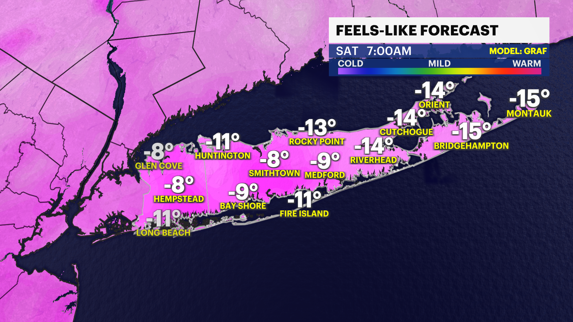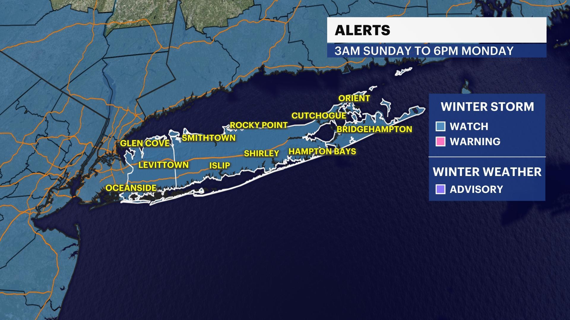WHAT'S NEW: Winter storm watches are posted for all of Long Island. These come from the National Weather Service and will be converted to winter storm warnings as we get closer to the storm. A cold weather advisory is posted for all of Long Island for dangerous cold Friday night through Saturday morning. Wind chills can be around -5 to -15 degrees! Please limit exposure to the cold during this time and dress in layers. We also now have higher confidence in storm progression and snow totals.