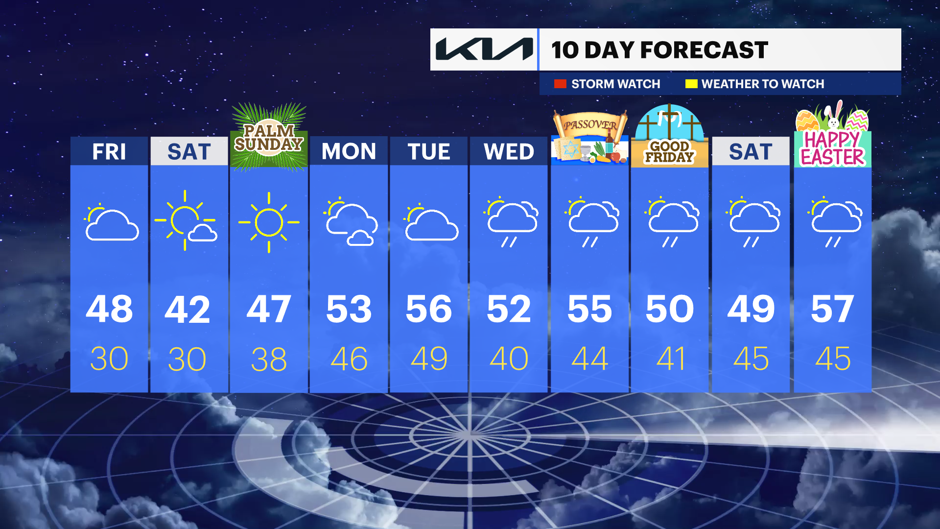 Cold air rushes in Friday night, setting the stage for a much colder start to the weekend. There’s a small chance of a brief mix of light rain or even a few wet snowflakes, but nothing significant is expected. Saturday will feel more like winter than spring—breezy and chilly, with temperatures only reaching the low to mid-40s and wind chills in the 20s early in the day.