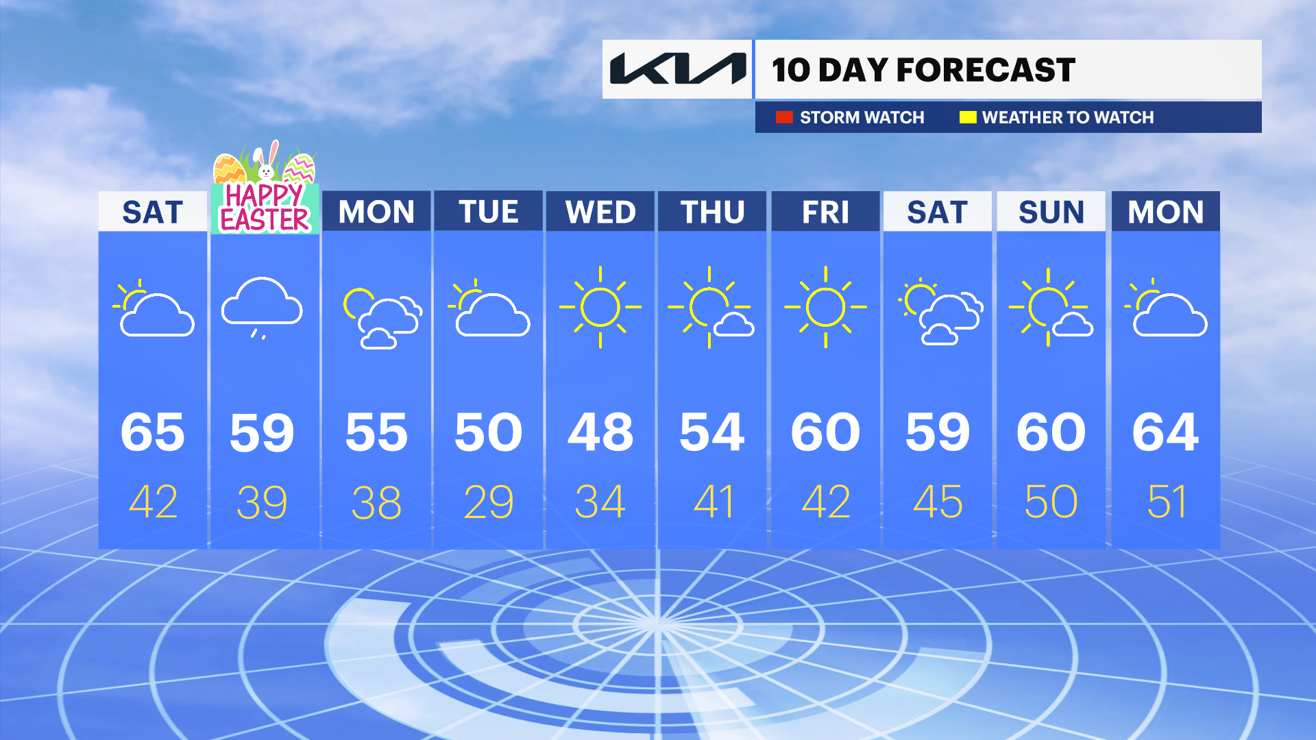 Following the front, temperatures dip slightly but remain above average into Friday, with dry weather returning to close out the week.