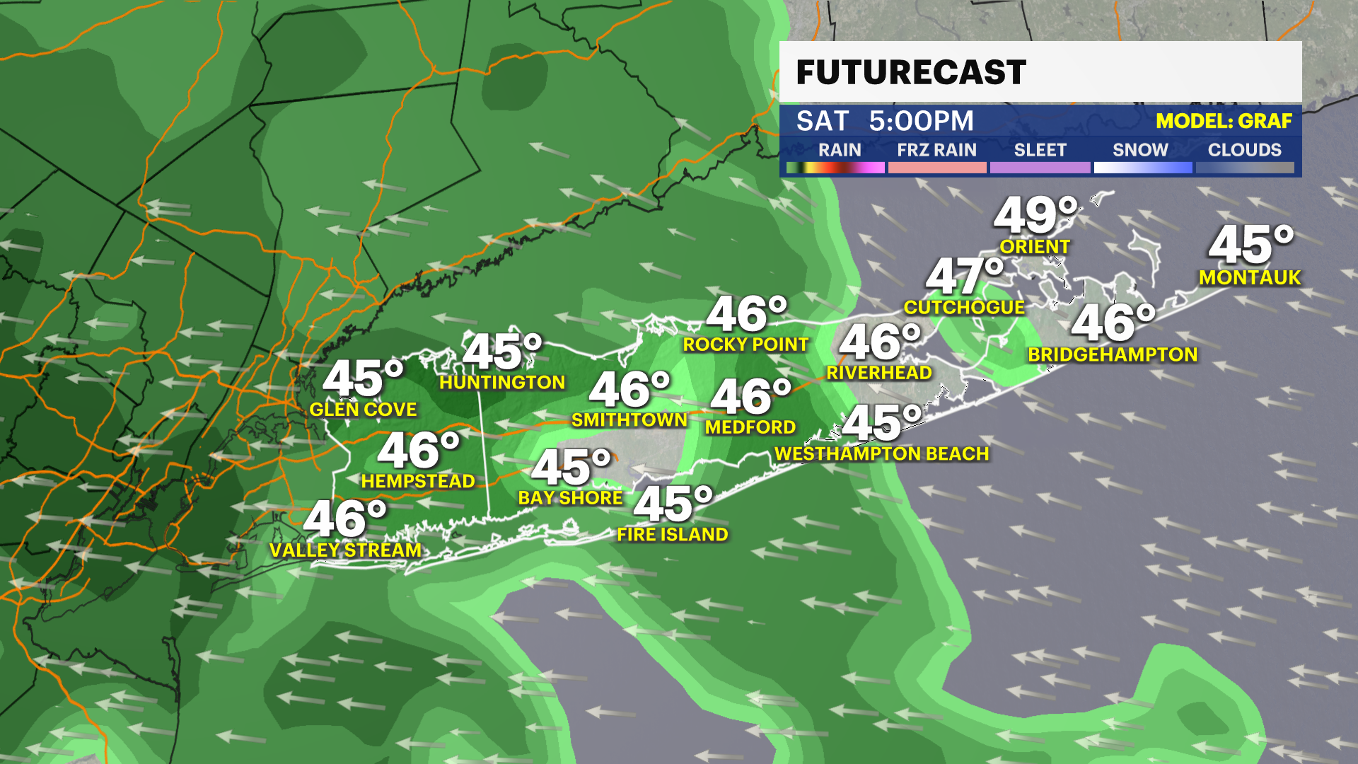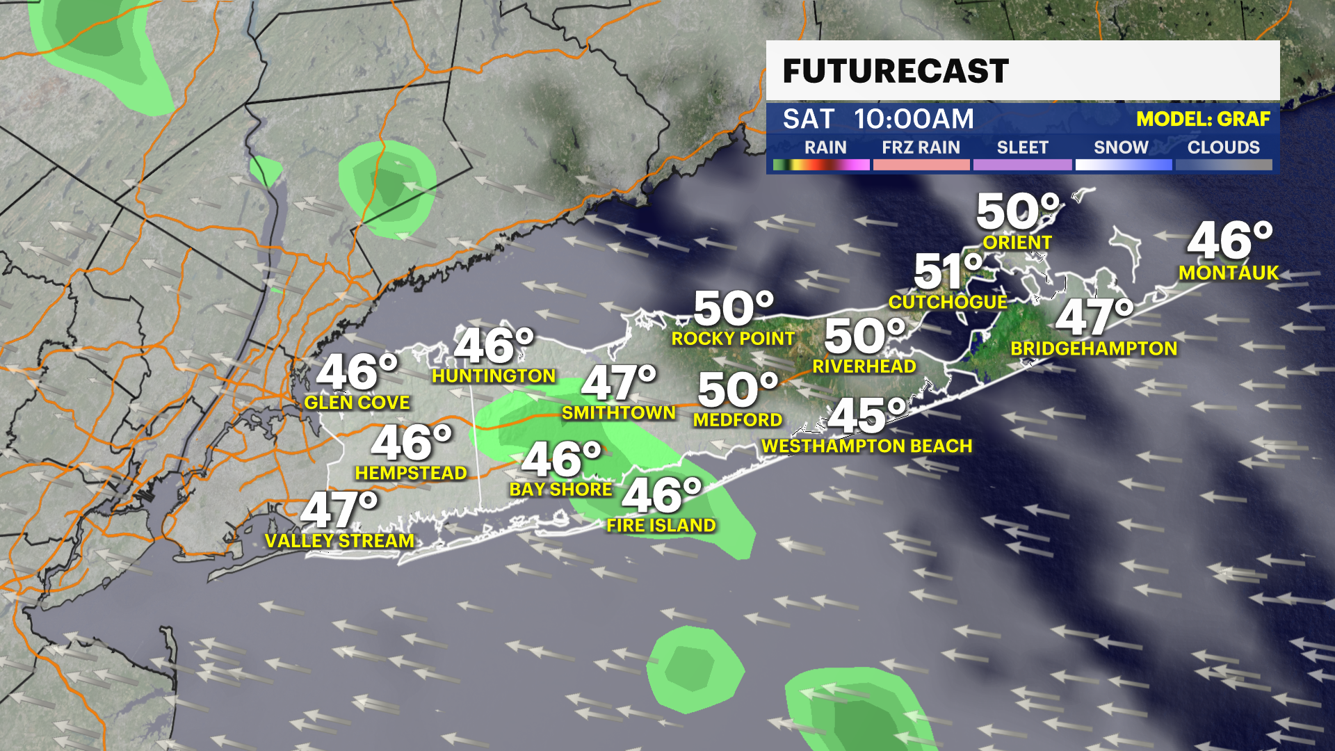 Saturday: Cloudy skies with periods of rain. Cool. Wet weather will impact outdoor events. Highs near 52. East wind 5 to 15 mph.