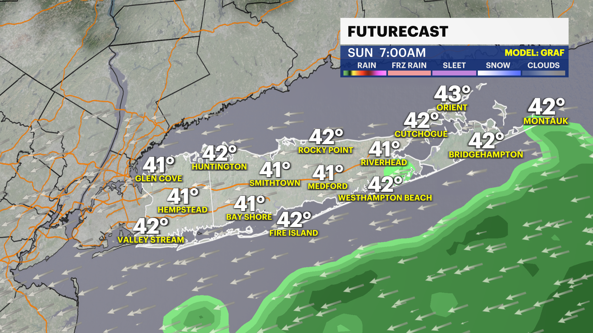 Sunday Night: Partly cloudy, with a low around 43.