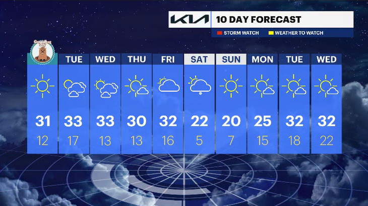 Tuesday: Mostly sunny start, not as cold or windy, afternoon clouds will increase. High temperatures: low 30s. Low temperatures: in the teens.