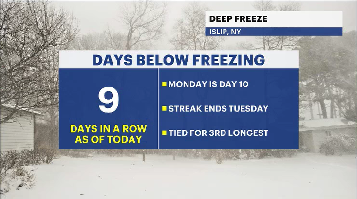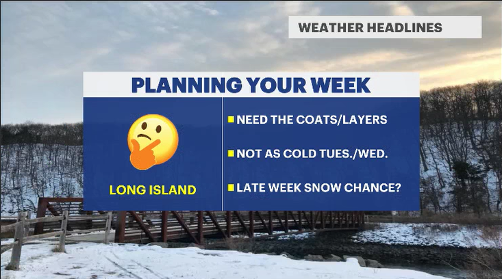 The streak of intense cold weather will continue through Monday for Long Island. However, there are some signs that the chill will be at least a little less harsh by Tuesday and Wednesday of next week.