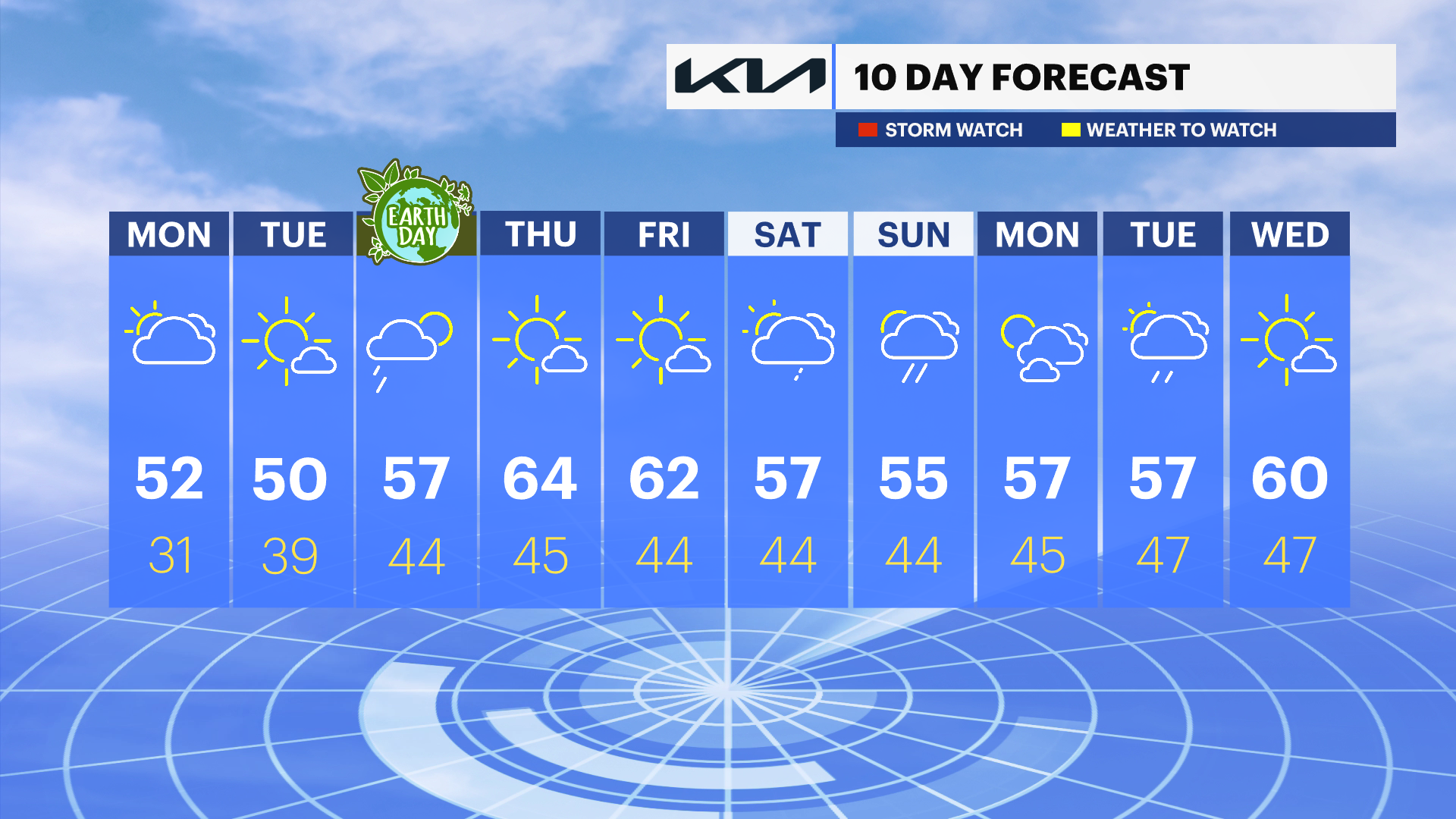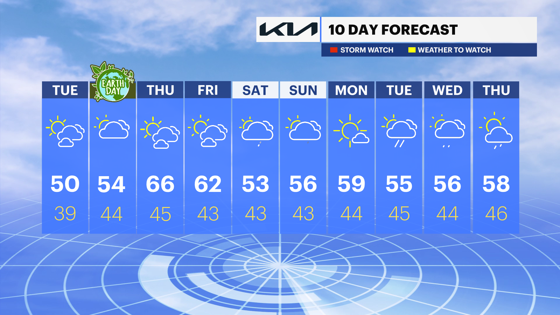 SUNDAY: Mostly cloudy with scattered rain showers likely. Not a complete washout. Highs around 56 degrees. Lows near 44 degrees.