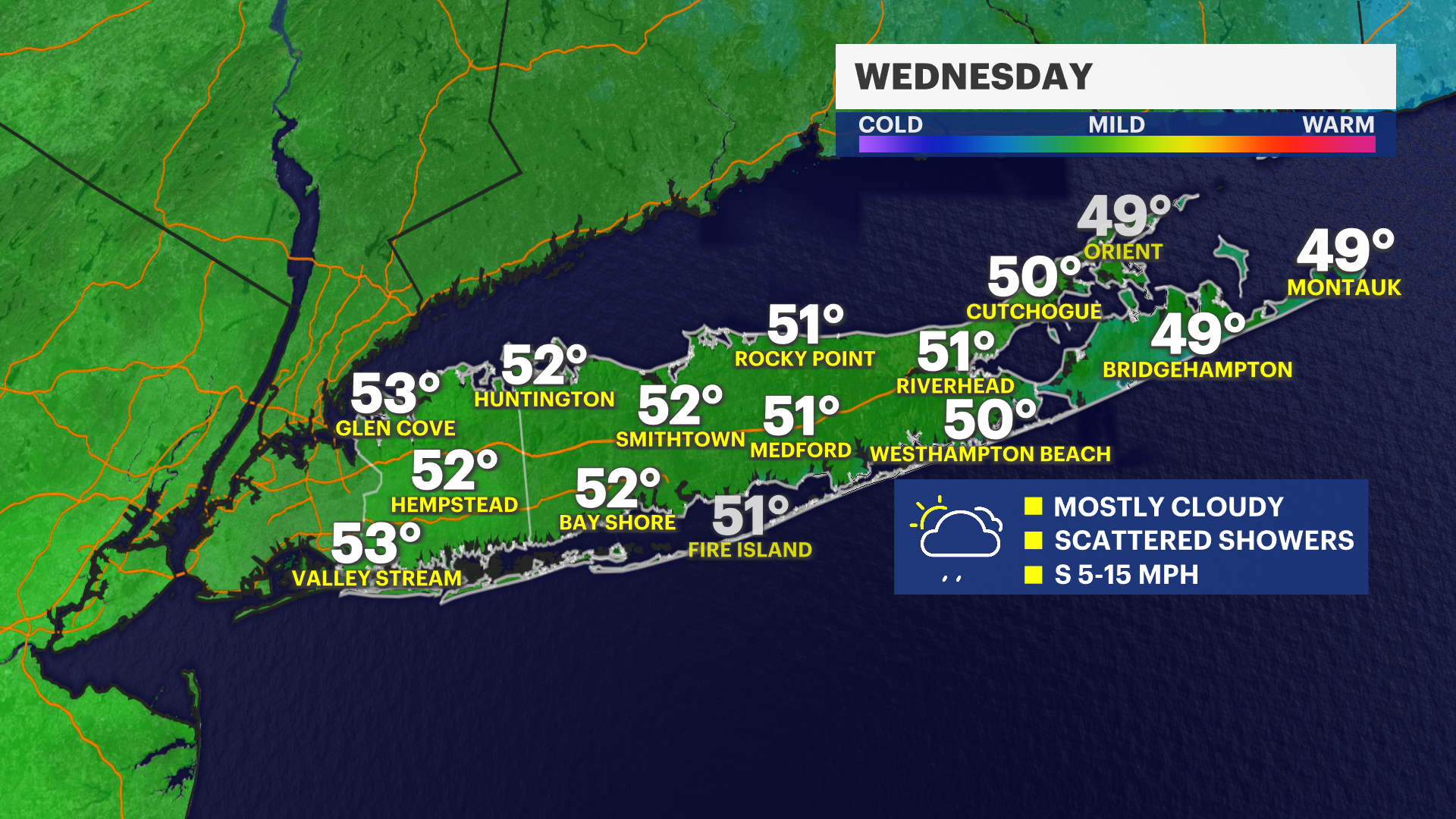 More clouds arrive Tuesday evening with spotty light rain showers moving in after 9 p.m. We do need rain here on Long Island, and while this scattered rain Tuesday night into Wednesday morning will not be enough to fix the dry conditions, you will want a rain jacket or umbrella during this time. Scattered showers will end Wednesday morning with breaks of sun into Wednesday afternoon.