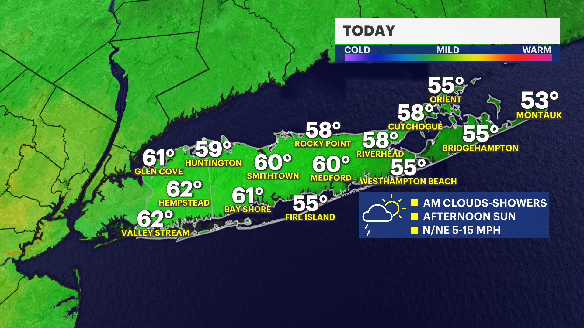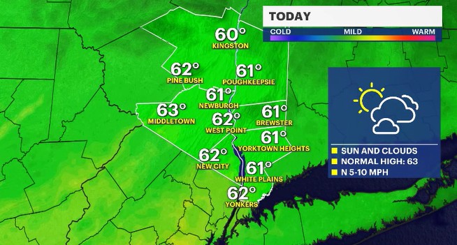 For Friday, we’ll start the day with clouds and spotty shower before 9am, but conditions improve as we move into the afternoon with some sunshine returning. It’ll be a bit cooler compared to today, with highs generally in the upper 50s and lower 60s—still comfortable, just not quite as warm.