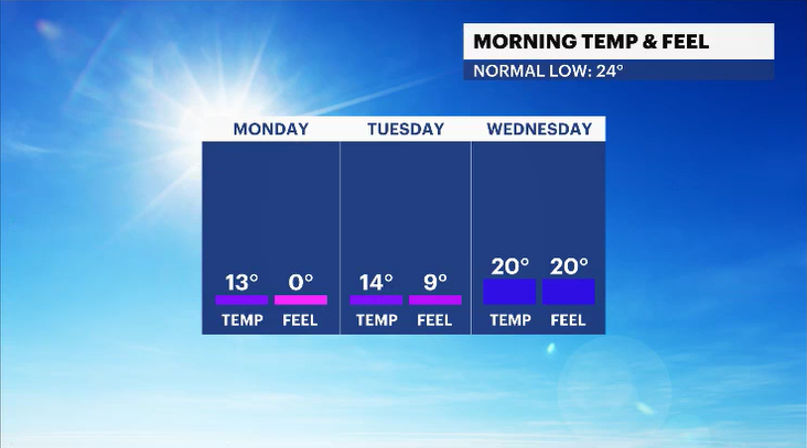Monday: Extremely cold morning, mostly sunny, and lighter wind by the afternoon. It will still be frigid. High temperatures: low 30s. Low temperatures: in the single digits. Wind chill values will range from the teens to single digits.