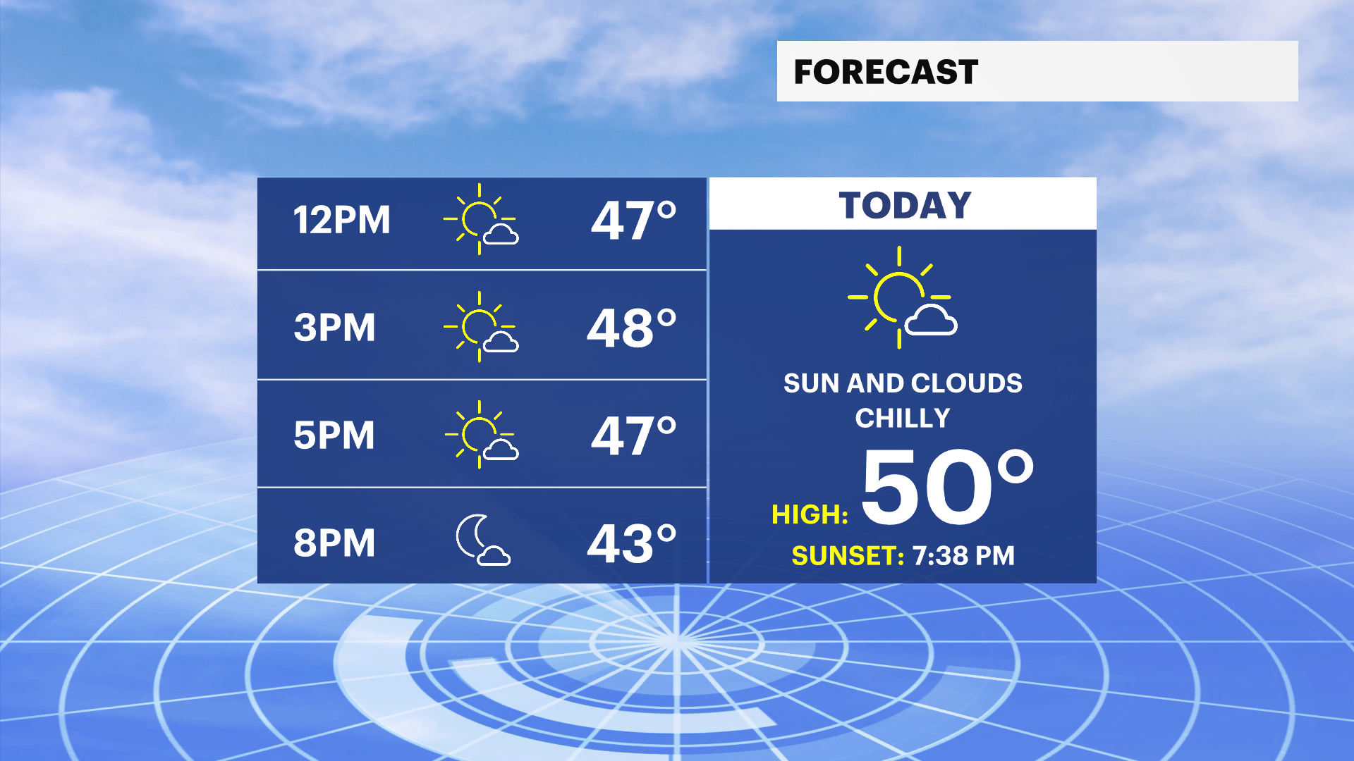 TUESDAY: A cold start with morning temperatures feeling like the upper 20s to low 30s before 8 a.m. After 8 a.m., temperatures will begin to rise into the 40s. Mostly sunny to partly cloudy with afternoon highs close to 50 degrees. A few scattered rain showers will start moving through after 9 p.m. Overnight lows near 39 degrees.