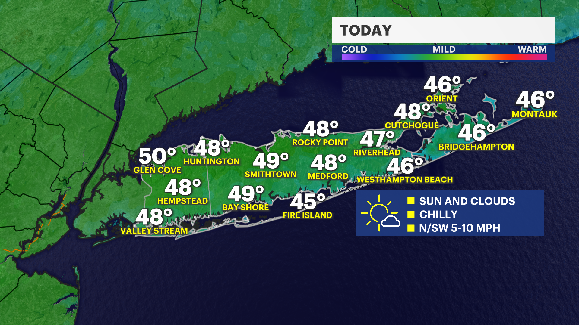 It becomes more seasonable on Wednesday with highs returning to the upper 50s across much of Long Island. Thursday and Friday will be our warmest and nicest days this week, with highs in the upper 50s to middle 60s. It does cool down a bit into the weekend with scattered showers possible both Saturday and Sunday. Overnight low temperatures will be mostly in the 40s after tonight over the next 10 days, which will hopefully bring an end to any isolated frost or freeze conditions for the season going forward.