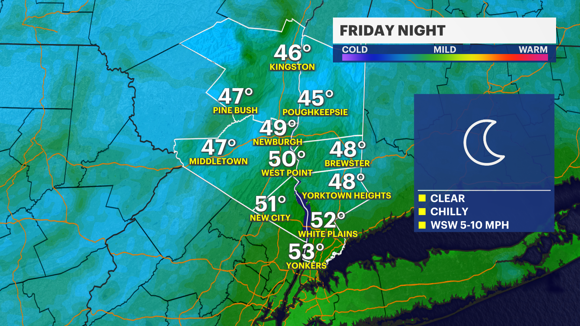 Temperatures begin to climb again on Friday, reaching the low 70s.