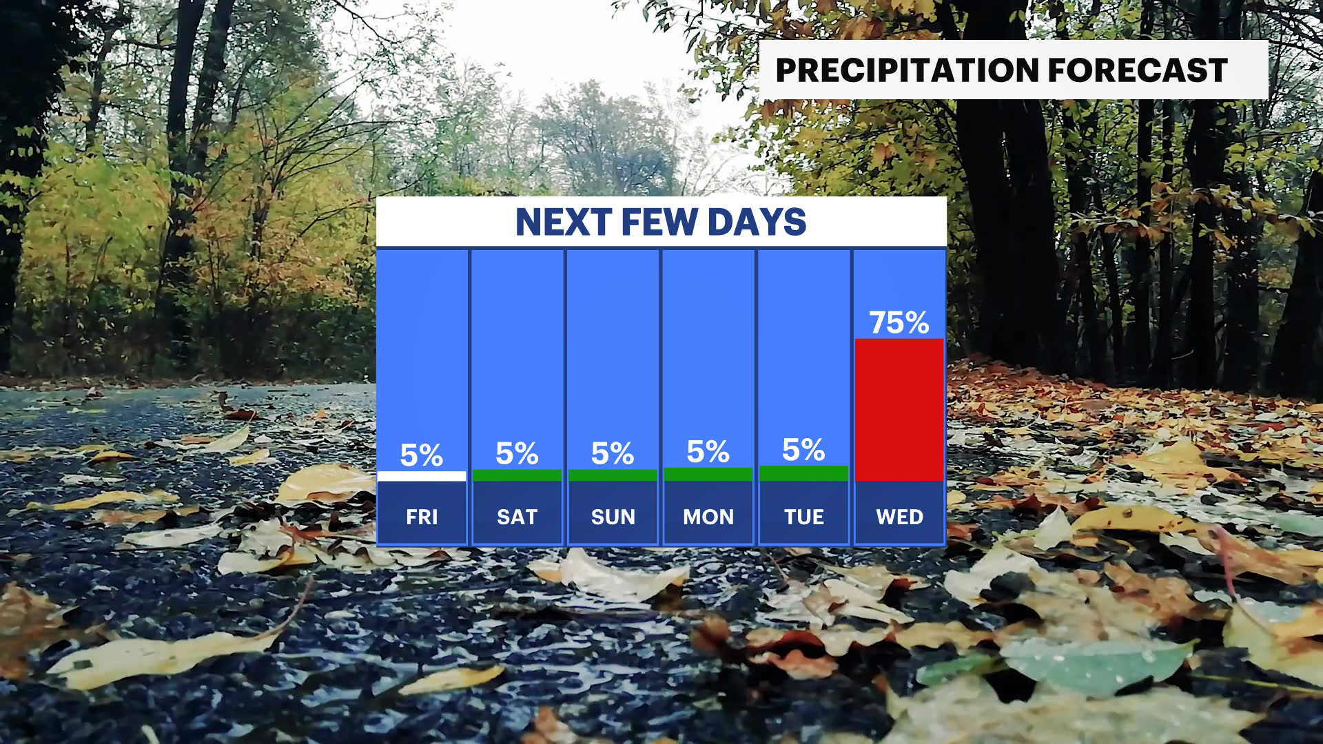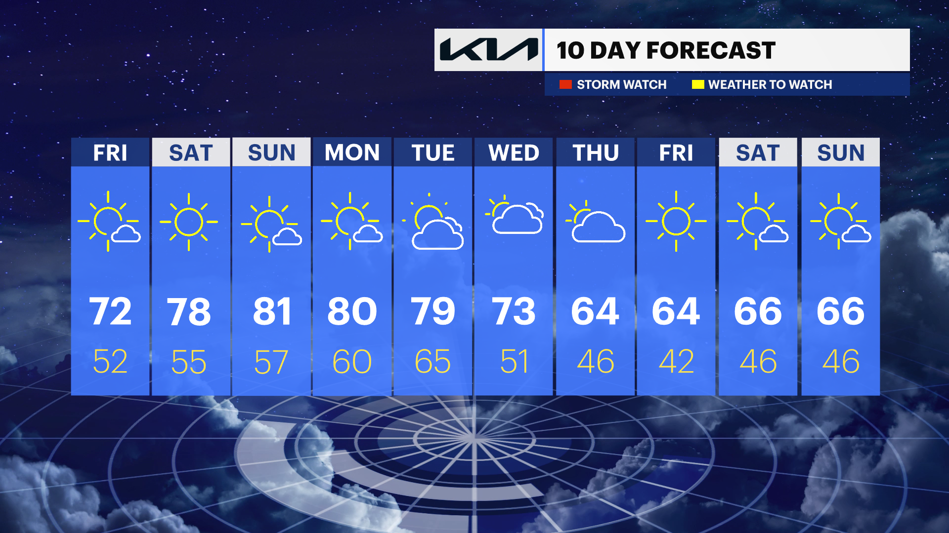 By next Wednesday, highs will trend slightly cooler, topping out in the 70s.