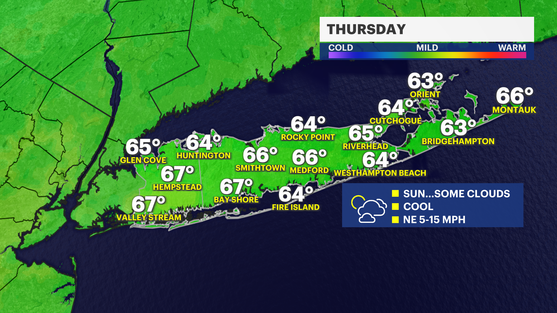 THURSDAY: A sunny start with some clouds mixing with sunshine for the afternoon. Cool, but nice with high temperatures around 65 degrees. Lows around 48 degrees.