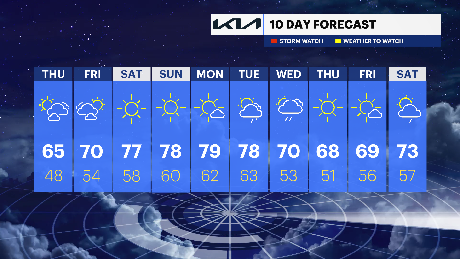 SUNDAY: Another beautiful day with plenty of sunshine and high temperatures around 78 degrees. Lows near 60 degrees.