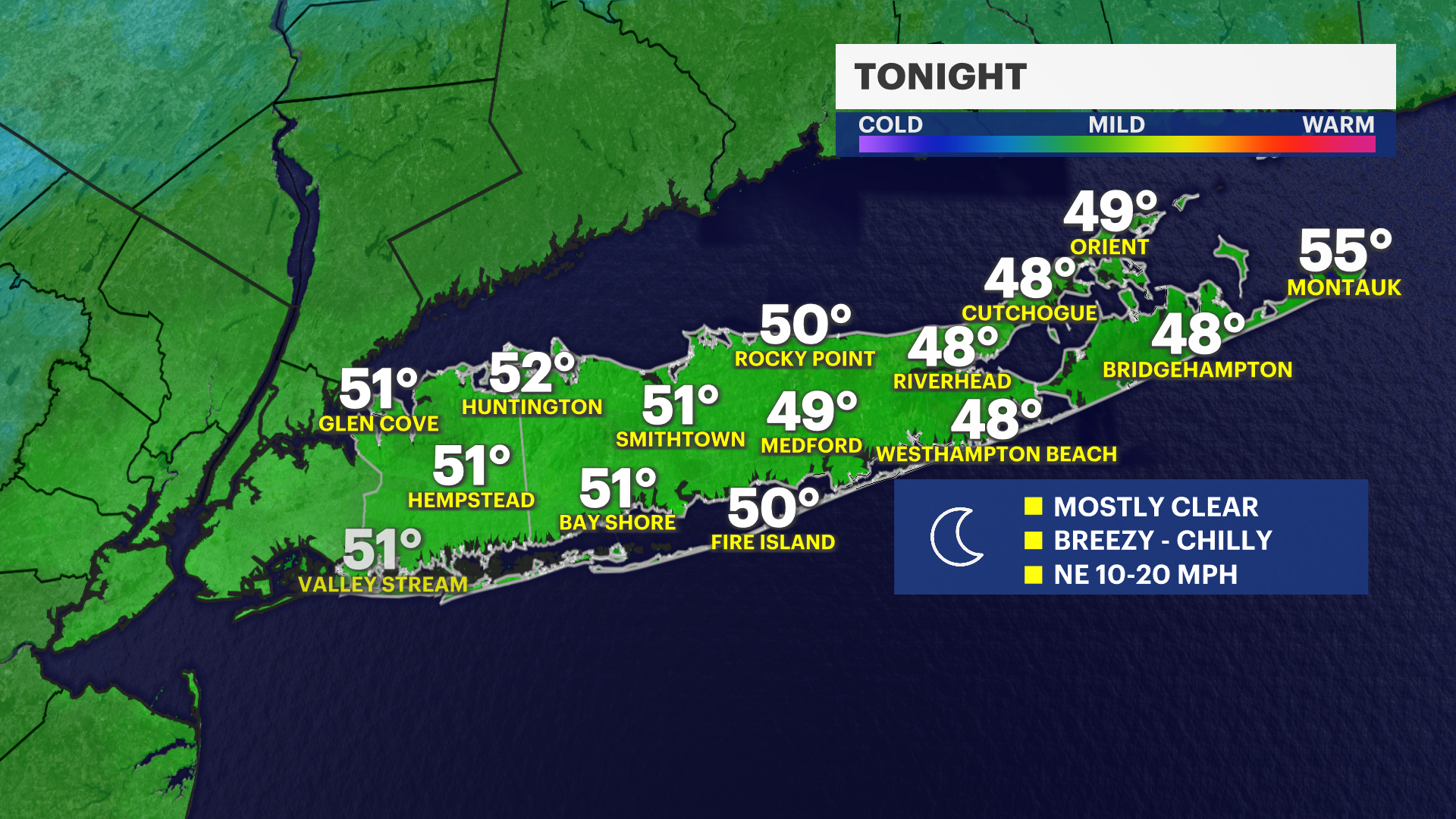 TONIGHT: Mostly clear and breezy with lows around the upper 40s to low 50s.