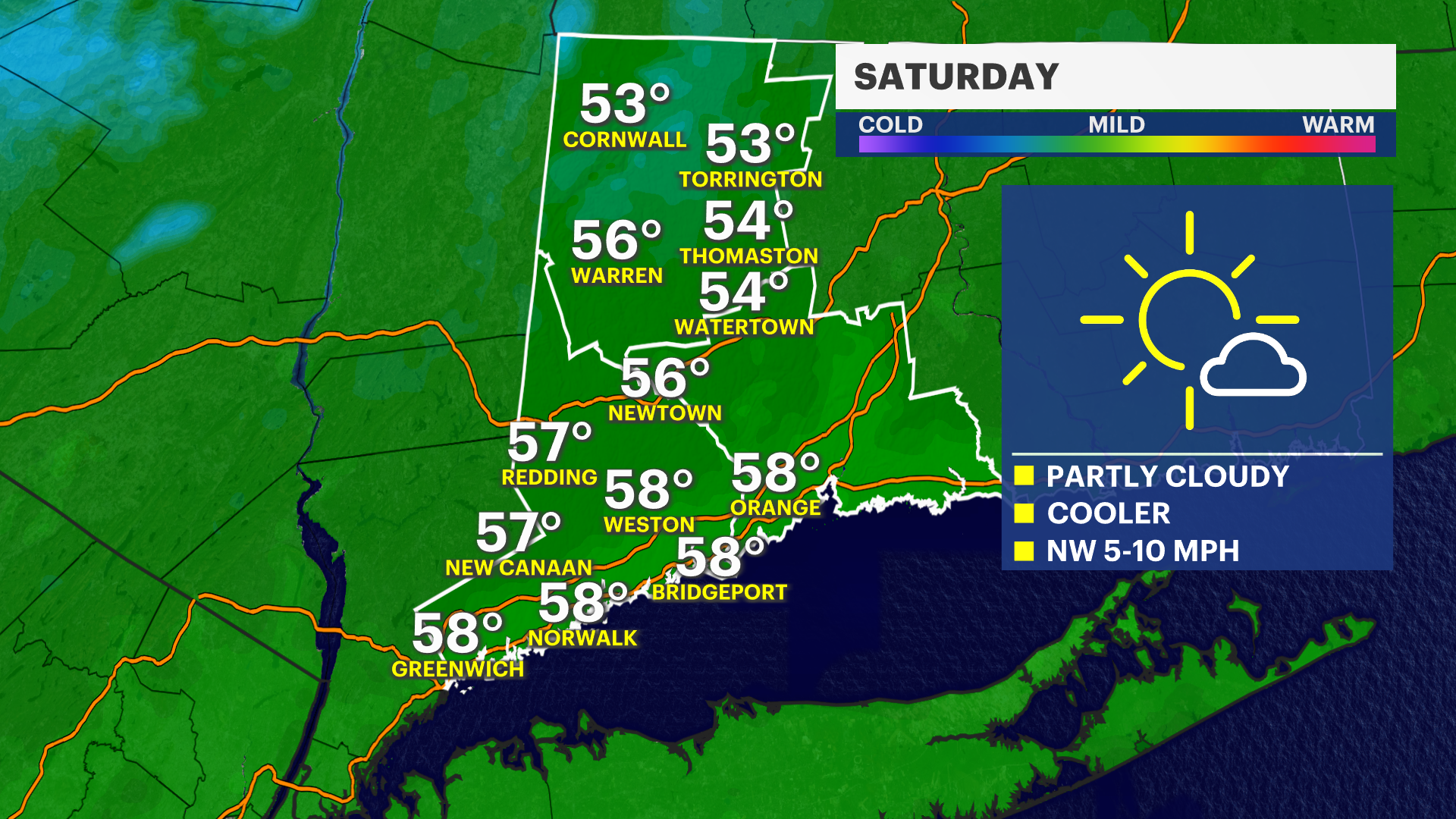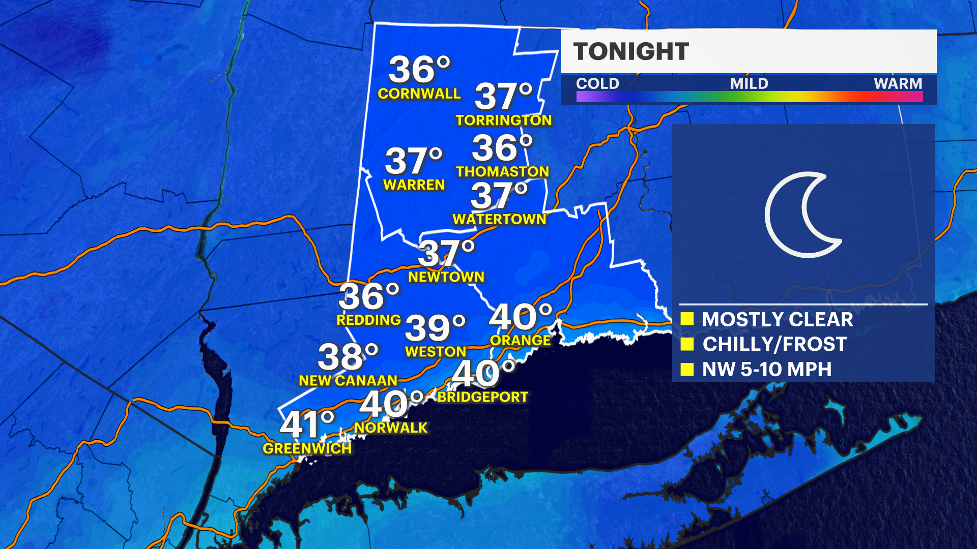 A frosty start is on the way for Western Connecticut. Some of the coldest temperatures will be felt across the area with temperatures as low as the middle 30s. The National Weather Service issued a frost advisory for Northern Fairfield County until 9 a.m. Saturday.