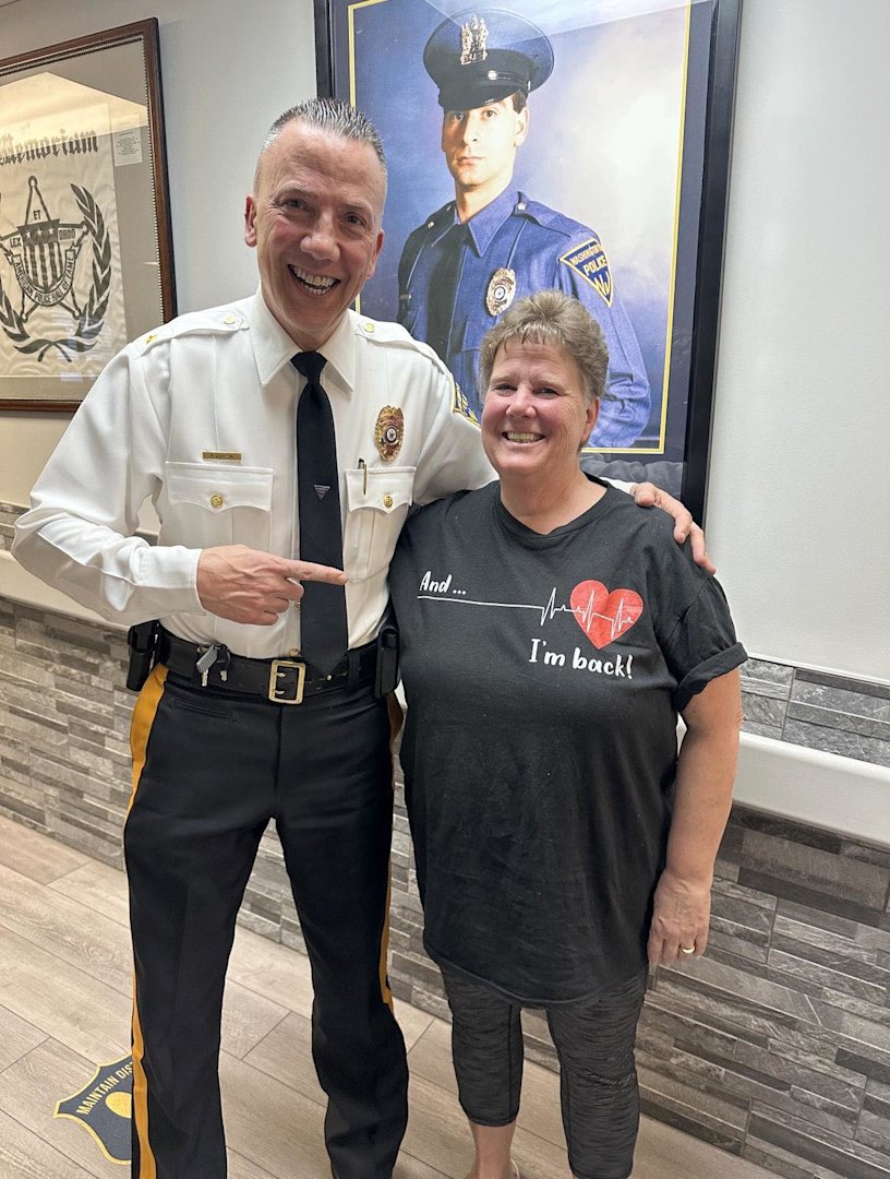 The driver crashed her car following a medical emergency last month. An emotional reunion took place at the Washington Township Police Department Wednesday as a woman stopped by to thank the platoon of patrol officers who revived her after she suffered a heart attack and crashed her vehicle a block away from headquarters. On March 28 at about 8:23 a.m., officers responded to Greentree Road for a report of a motor vehicle crash in front of an assisted living facility. The driver was reported to be unconscious and not breathing. "Within one minute, Officers Tucker, Swan, McNair, Dante Moore — on his first day of solo patrol — Cicatiello, and Matos arrived on scene," Washington Township Police said in a statement. "Officers located the driver unresponsive, locked inside the vehicle. They quickly forced entry by breaking several windows to gain access. After removing the driver, they determined she was not breathing and had no pulse." Officers began CPR and used a defibrillator in an attempt to restart her heart. They continued life-saving efforts until EMS workers arrived and transported the woman, identified as Mrs. Friedrich, to Jefferson Hospital. "She’s expected to make a full recovery from the cardiac arrest and broken ribs from the CPR compressions," police said. On Wednesday, Friedrich — wearing a shirt proudly stating "I'm back" — visited headquarters with her family and a catered Chick-fil-A meal to express gratitude for the officers' efforts.