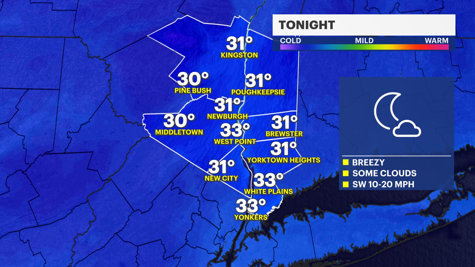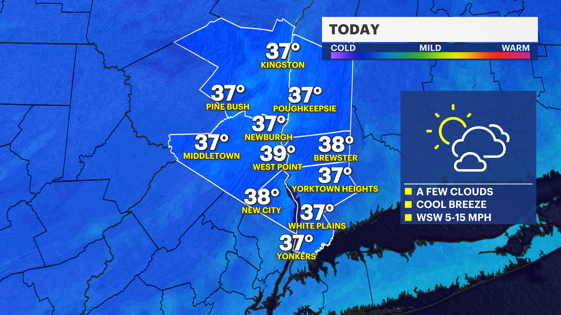 A sunny day to start with morning temperatures in the upper 30s and near 40. Windy in the afternoon and much colder in the evening, in the 20s for overnight plans.