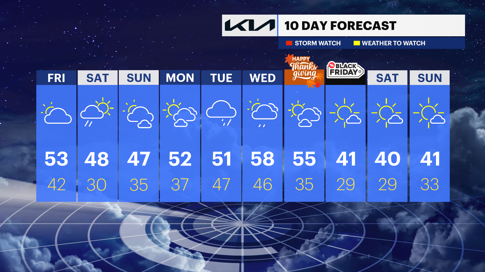 THURSDAY: THANKSGIVING - Morning showers fade to mostly sunny skies. Highs: mid 50s. Lows: mid-30s.