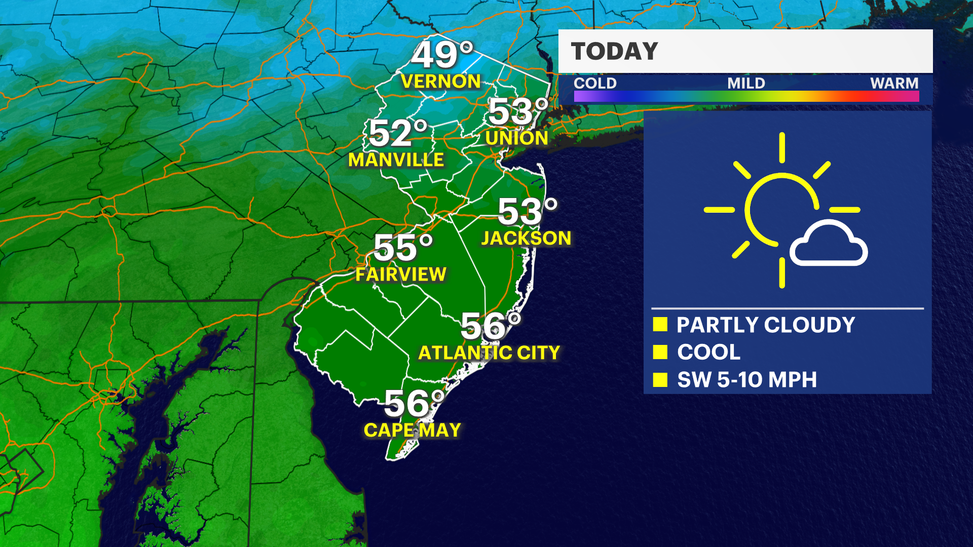 Today brings a bright, partly sunny day with a cool feel, followed by a clear and chillier night as a light west breeze picks up.
