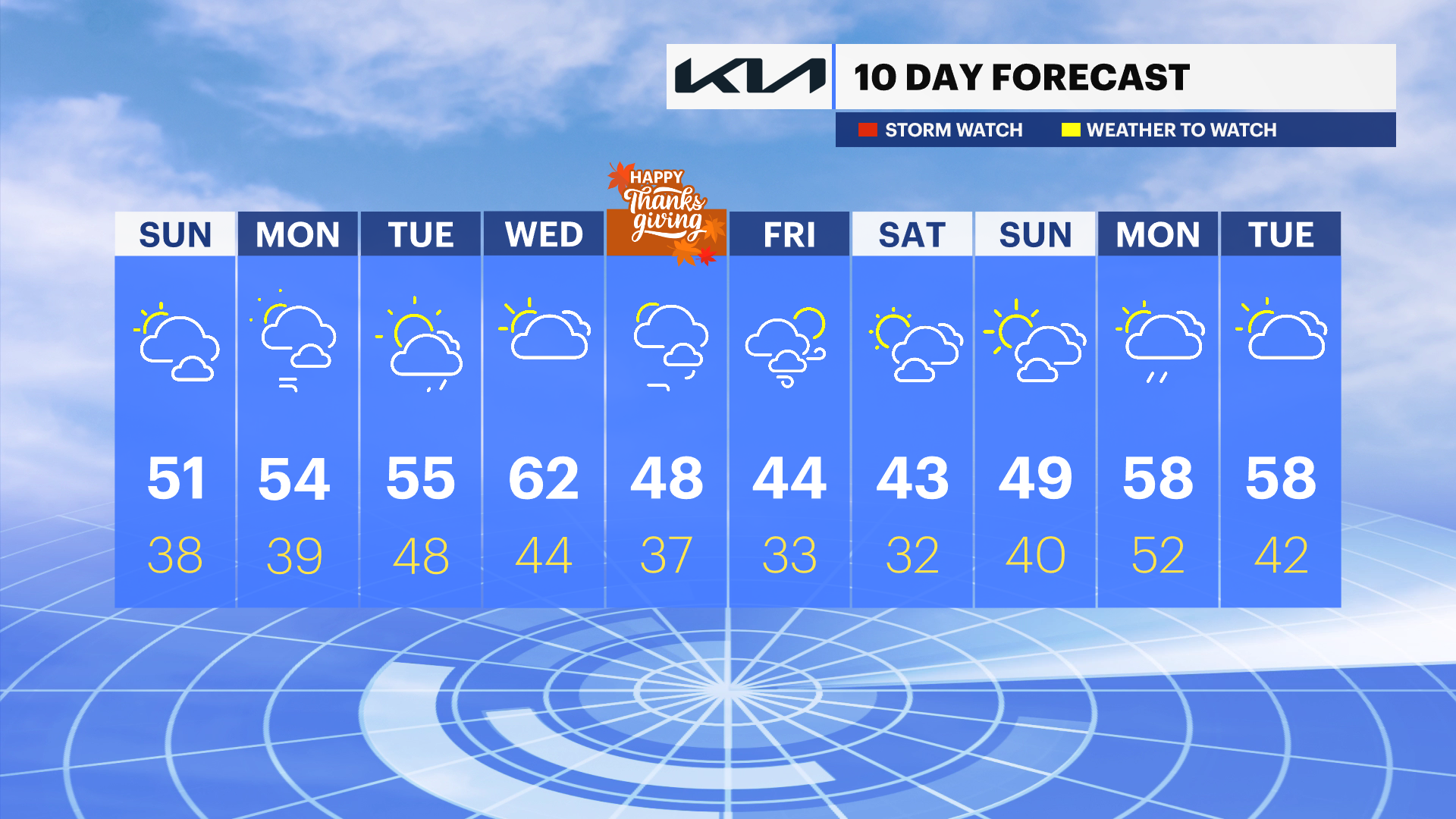 Midweek brings lingering, spotty showers Wednesday with milder temperatures, then drier and breezy conditions for Thanksgiving Day. The holiday looks bright but cool, with sunshine continuing into Friday and Saturday, along with crisp, seasonable air.