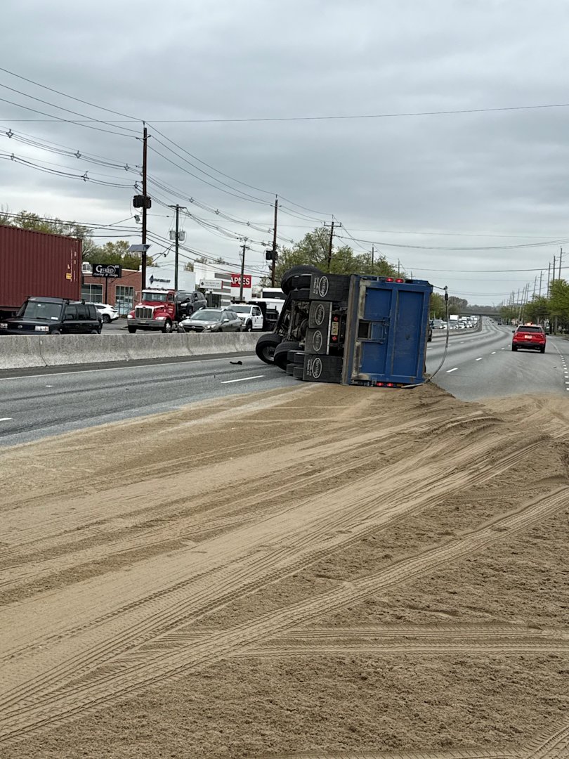 According to police, the driver told officers he was traveling in the center lane when another vehicle exiting Sears Drive cut him off. The driver said that he swerved to avoid a collision, causing the truck to overturn.