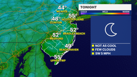 TONIGHT: Clear sky. Not as cold. Low 54.
