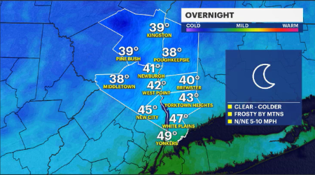 OVERNIGHT: Quite chilly with clear skies. A Freeze warning for western Ulster County. Lows in the mid- to upper 40s.