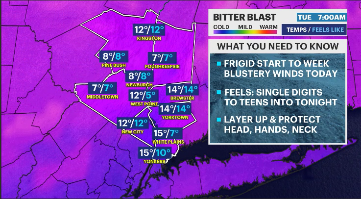 OVERNIGHT: Very cold, weaker wind, but still bitter under mostly clear skies. Lows in the teens and single digits for areas north of Westchester County.