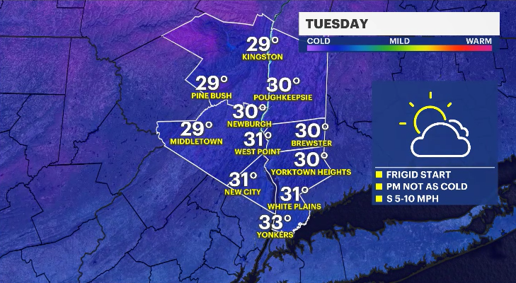 TUESDAY: Frigid morning with temperatures in the single digits and teens. Gradual improvement of temps in the afternoon. Clouds will increase in the evening. Dress warmly. Highs in the 30s. Lows in the 20s.