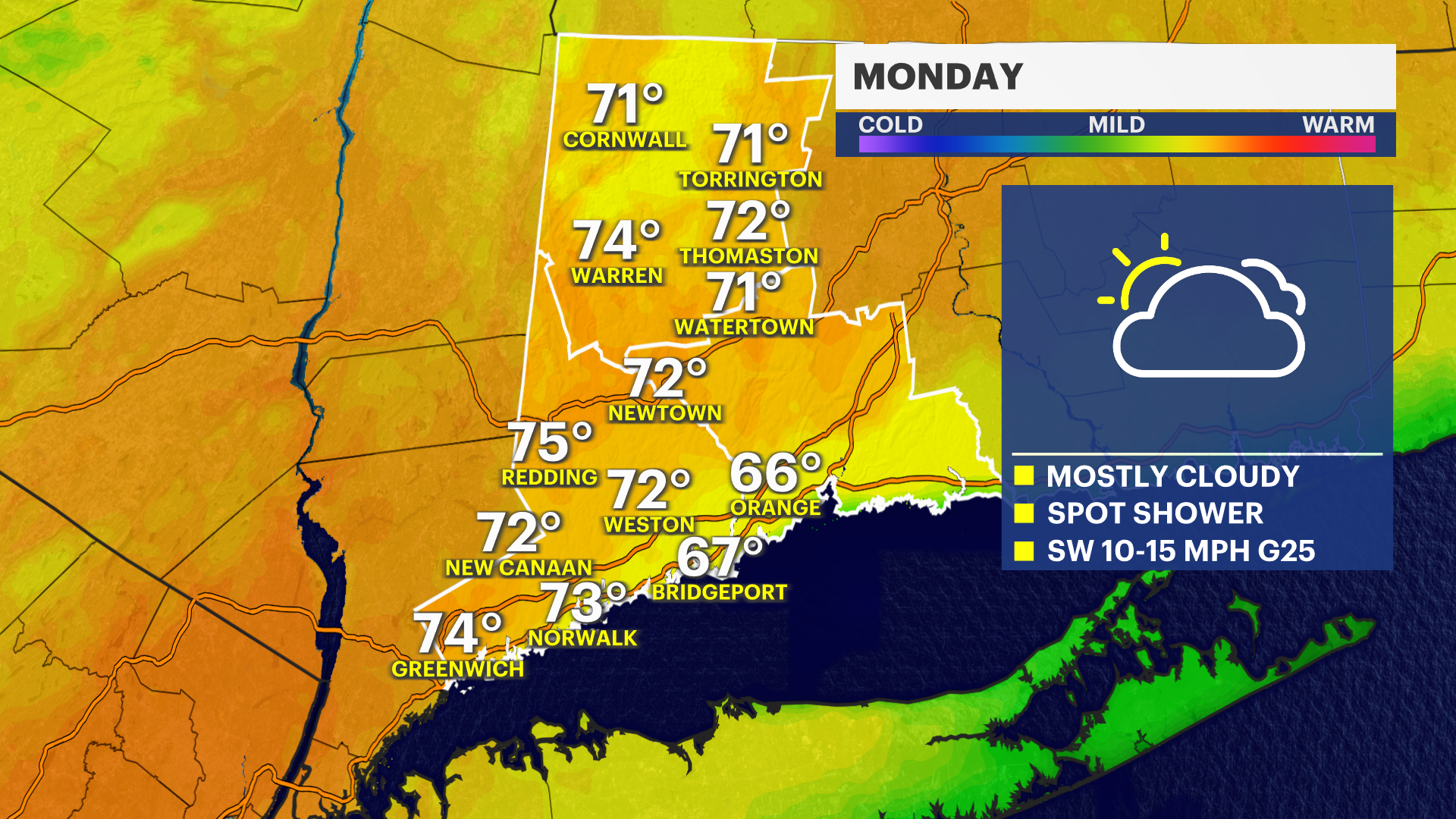 Temperatures on Monday will range from the 60s inland to cooler readings along the coast. A more pronounced warm-up arrives Tuesday through Friday, with temperatures reaching the 70s and, in some inland spots, 80 degrees.
