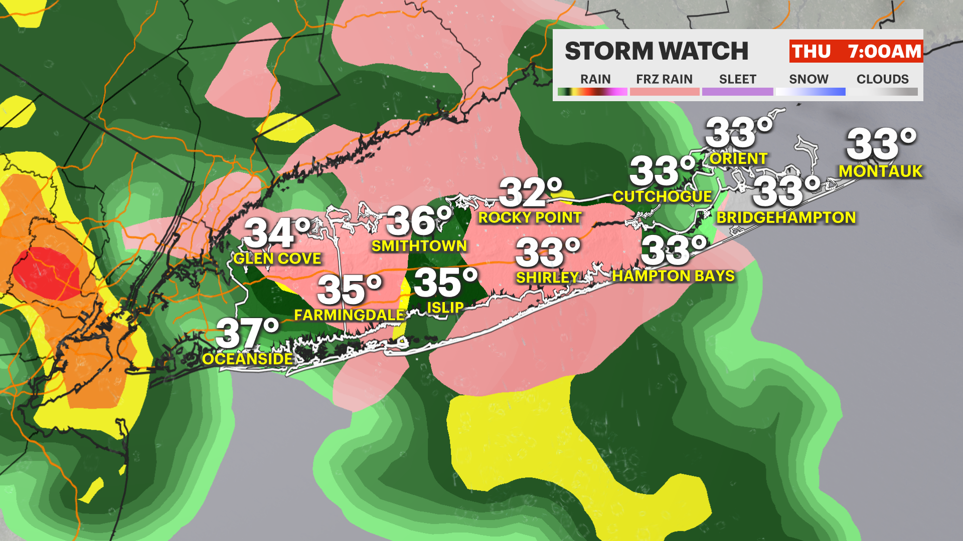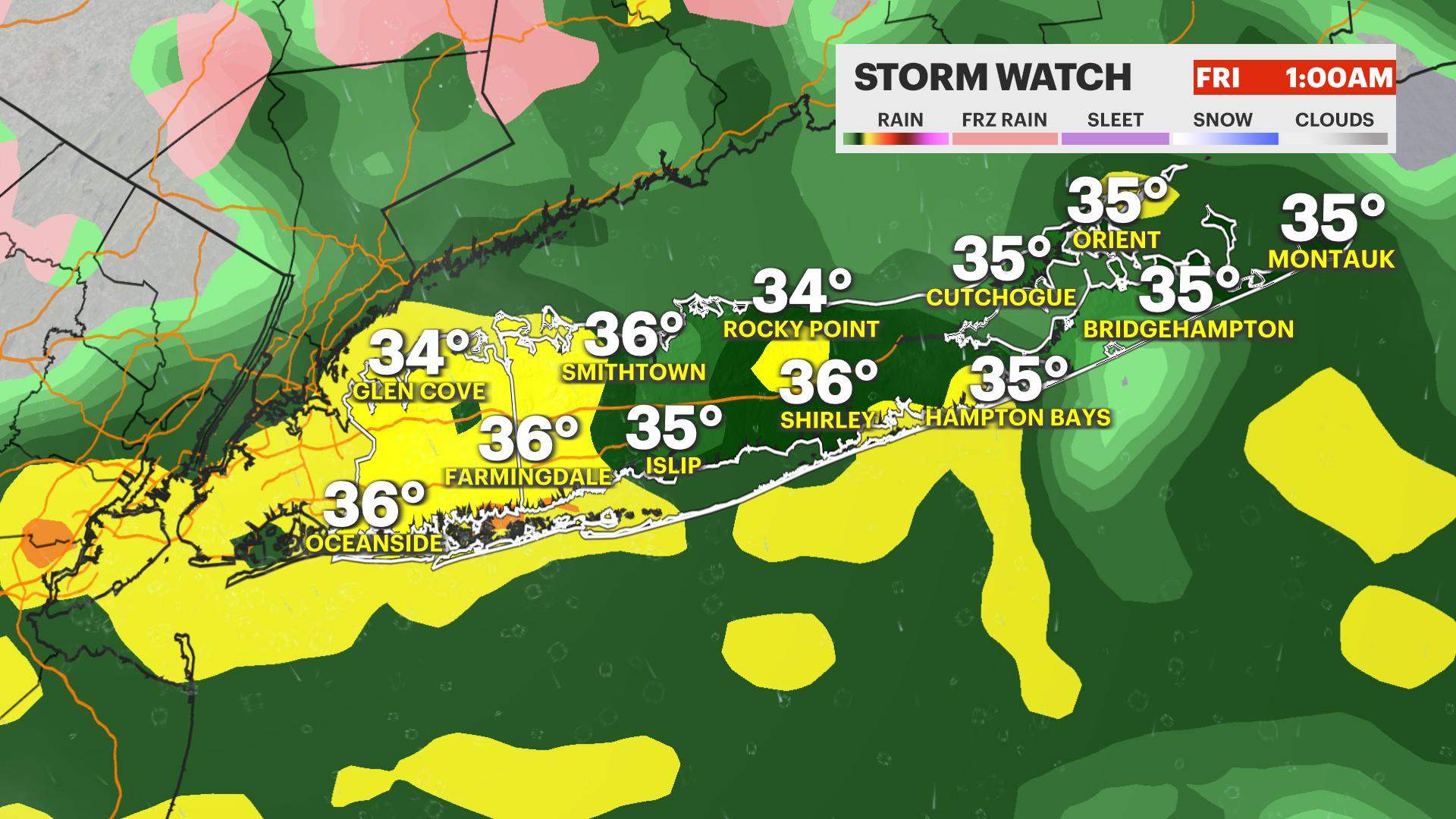 Clouds and rain are the big story today across Long Island. It’s a cold and damp setup with periods of rain moving through the area, and temperatures struggling to climb much at all. Highs will only reach around 39 degrees, so it’s one of those raw late-winter days where it feels chillier than the thermometer might suggest. With the clouds locked in and rain falling at times, it’ll definitely be a day for the rain jacket and maybe an extra layer. Be alert for the wet roads and large puddles driving around Long Island.