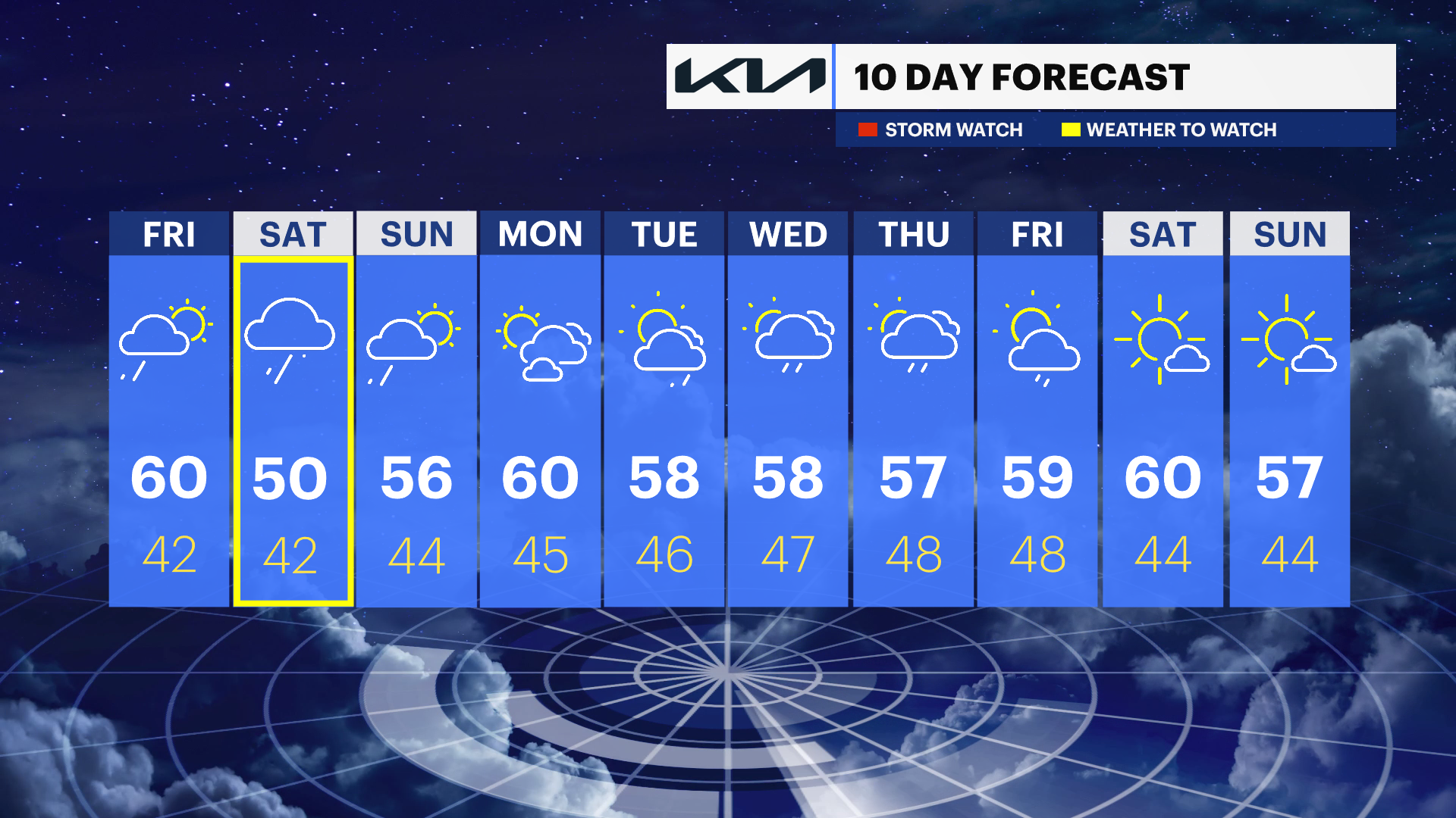SATURDAY: Mostly cloudy with periods of rain. This will likely be the wettest part of the weekend. Highs around 55 degrees. Lows near 43 degrees.