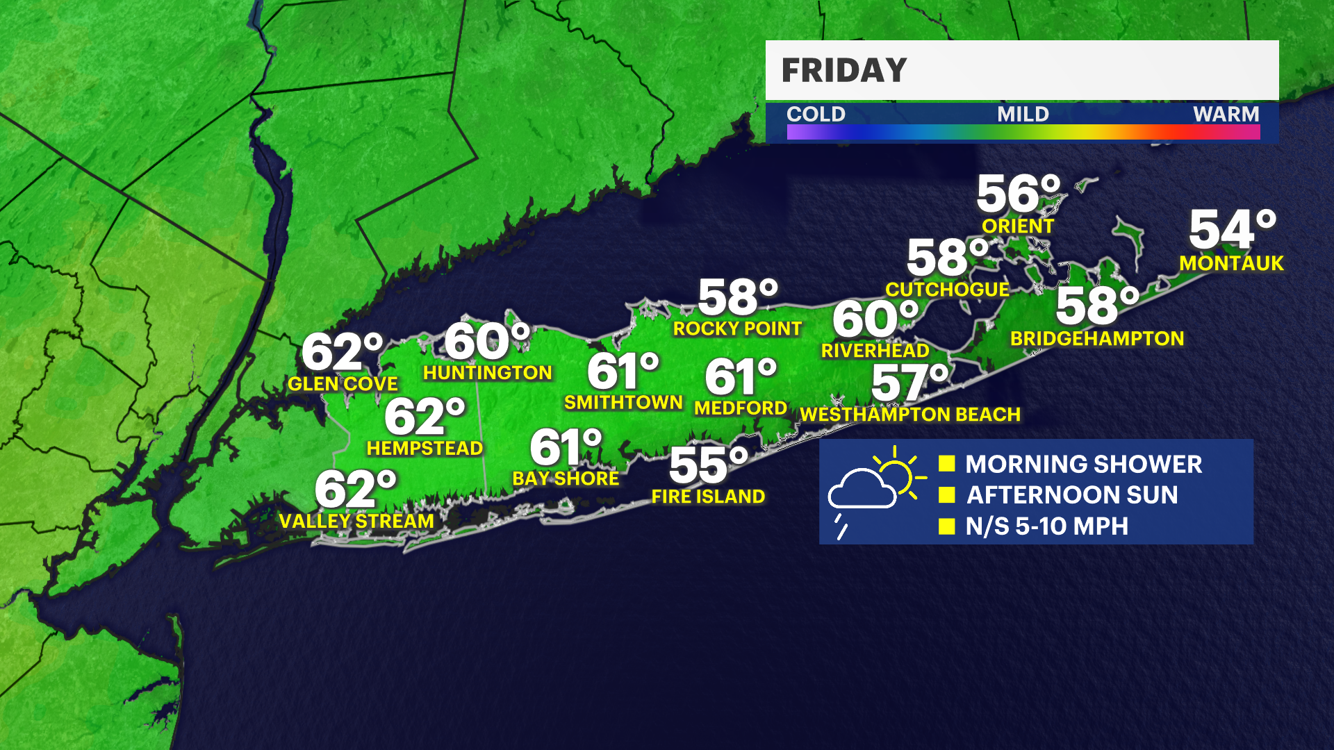 THURSDAY: PICK OF THE WEEK -- Mostly sunny to partly cloudy and warmer. Highs will be around 66 degrees. Parts of Nassau County will hit the lower 70s, while the South Shore and East End will be a bit cooler. Lows near 45 degrees.