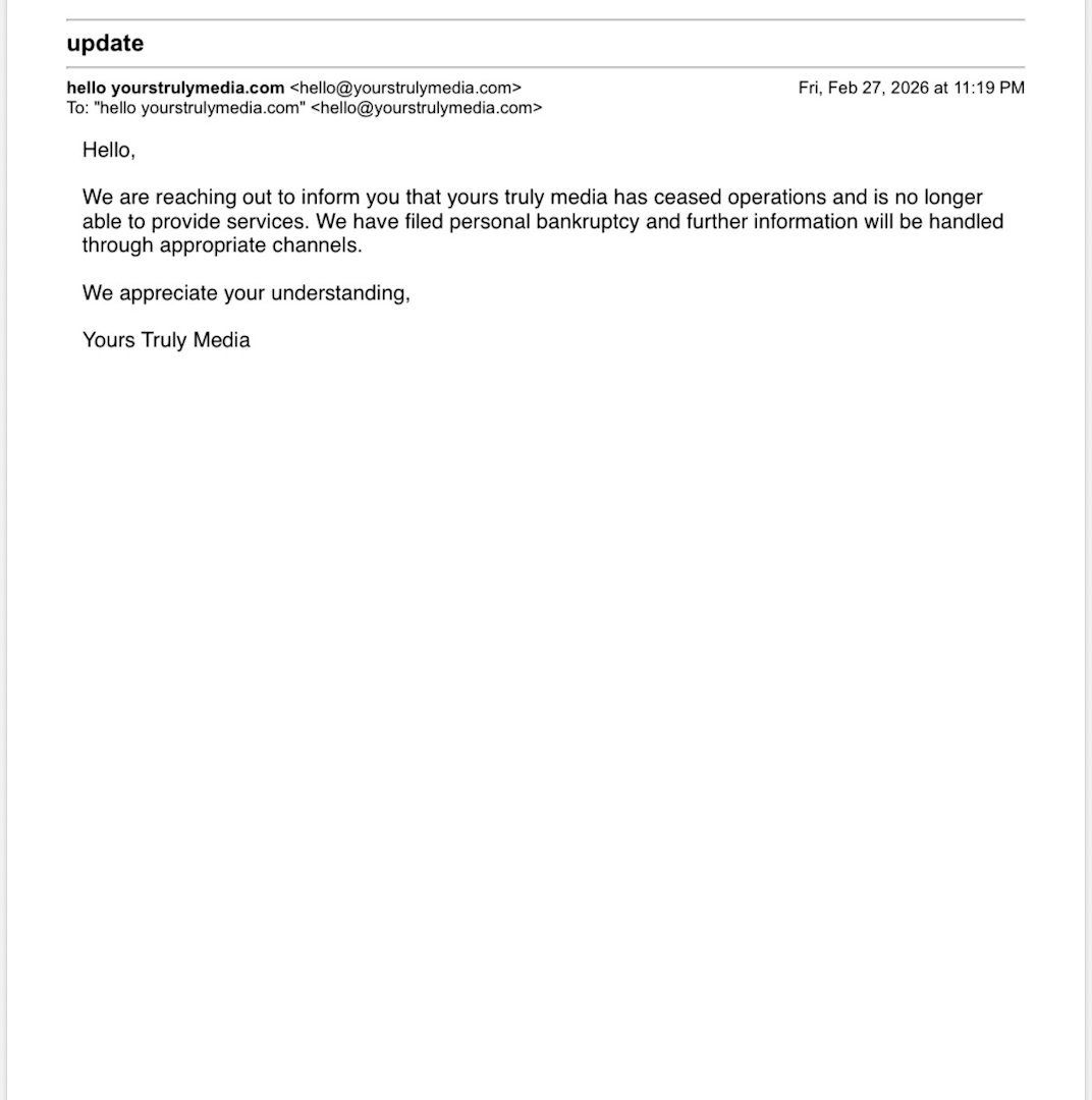 But just weeks later, Krauss says she received an email from Yours Truly Media saying the company was ceasing operations and filing for bankruptcy. Since then, she says she has been unable to get in touch with anyone from the company.