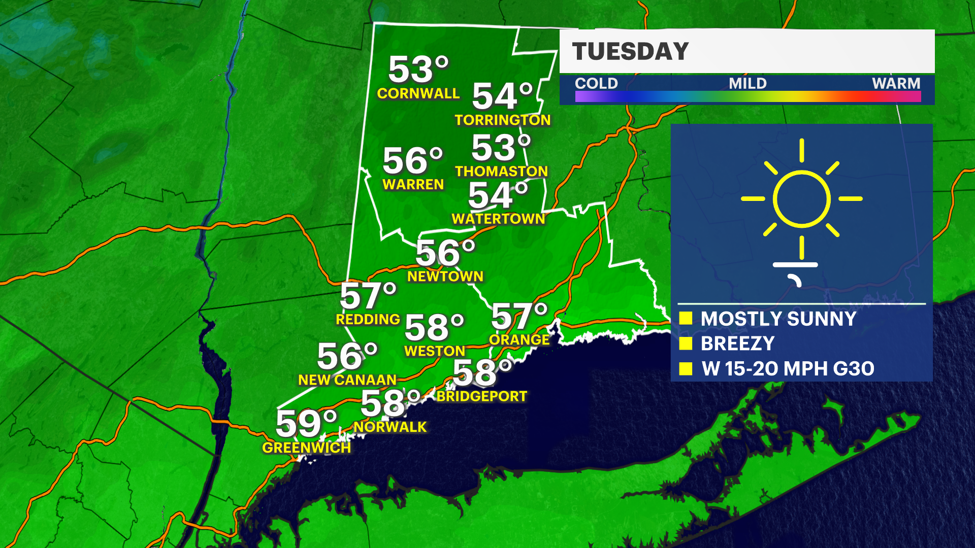 TUESDAY: Mostly sunny and breezy. High of 58.