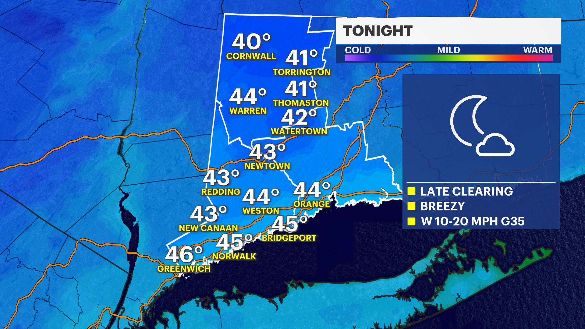 TONIGHT: Partly cloudy, then clear, breezy & cool. Low of 45.