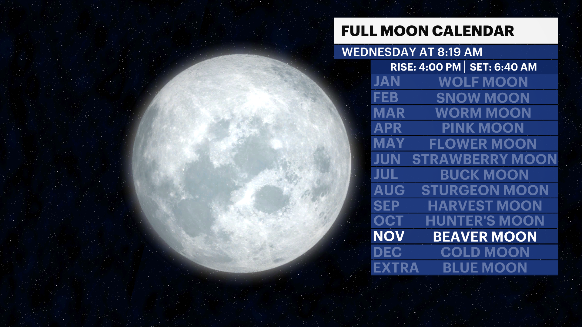 The full moon for the month of November will shine brightly on Wednesday, November 5th. The best chance to see the moon will be Tuesday night, as the sky will be clear. This full moon is known as the Beaver Moon and it will also