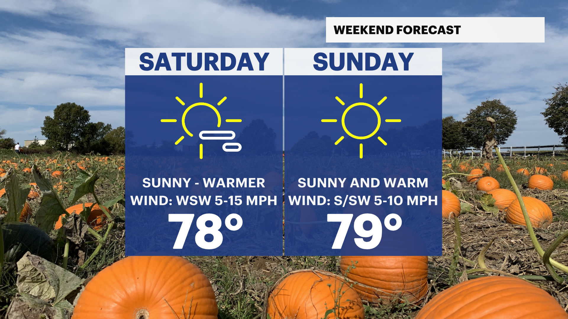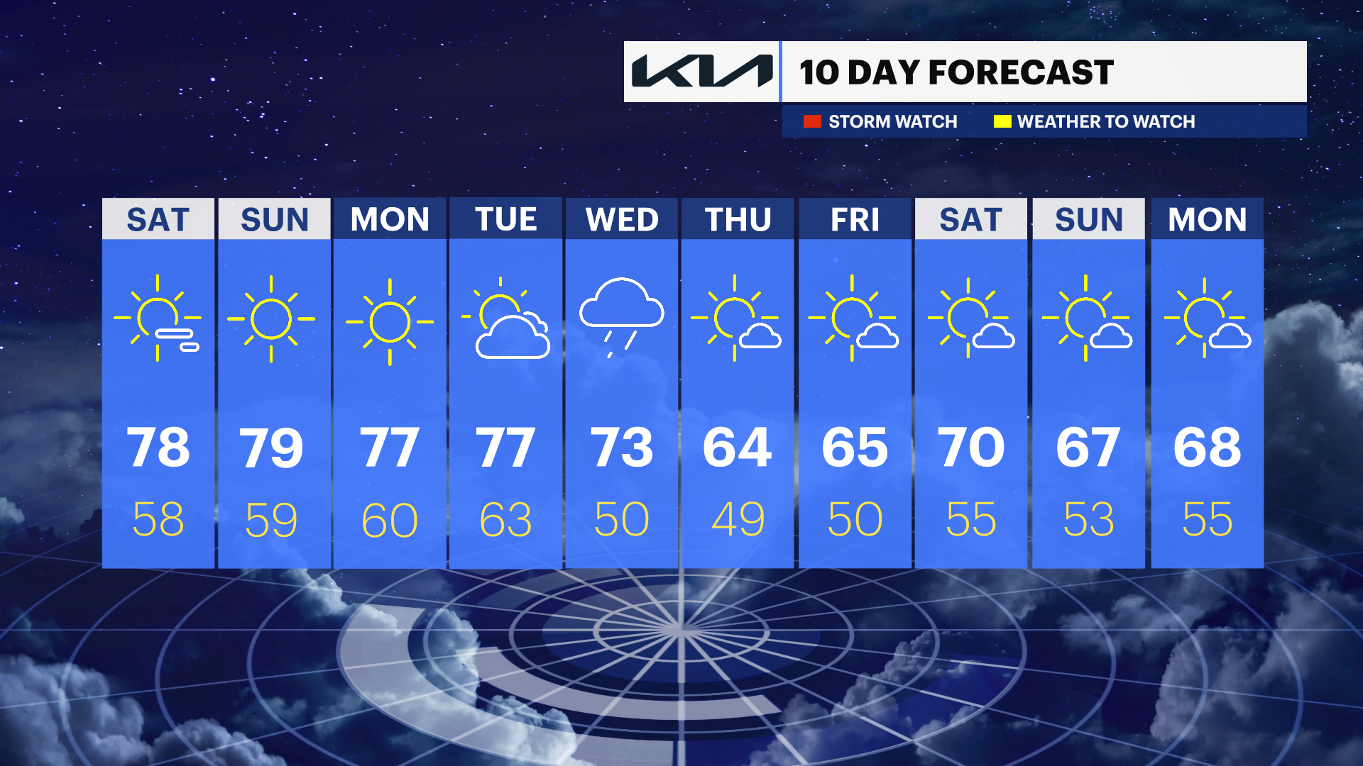 SUNDAY: Another beautiful day with plenty of sunshine and high temperatures around 79 degrees. Lows near 59 degrees.