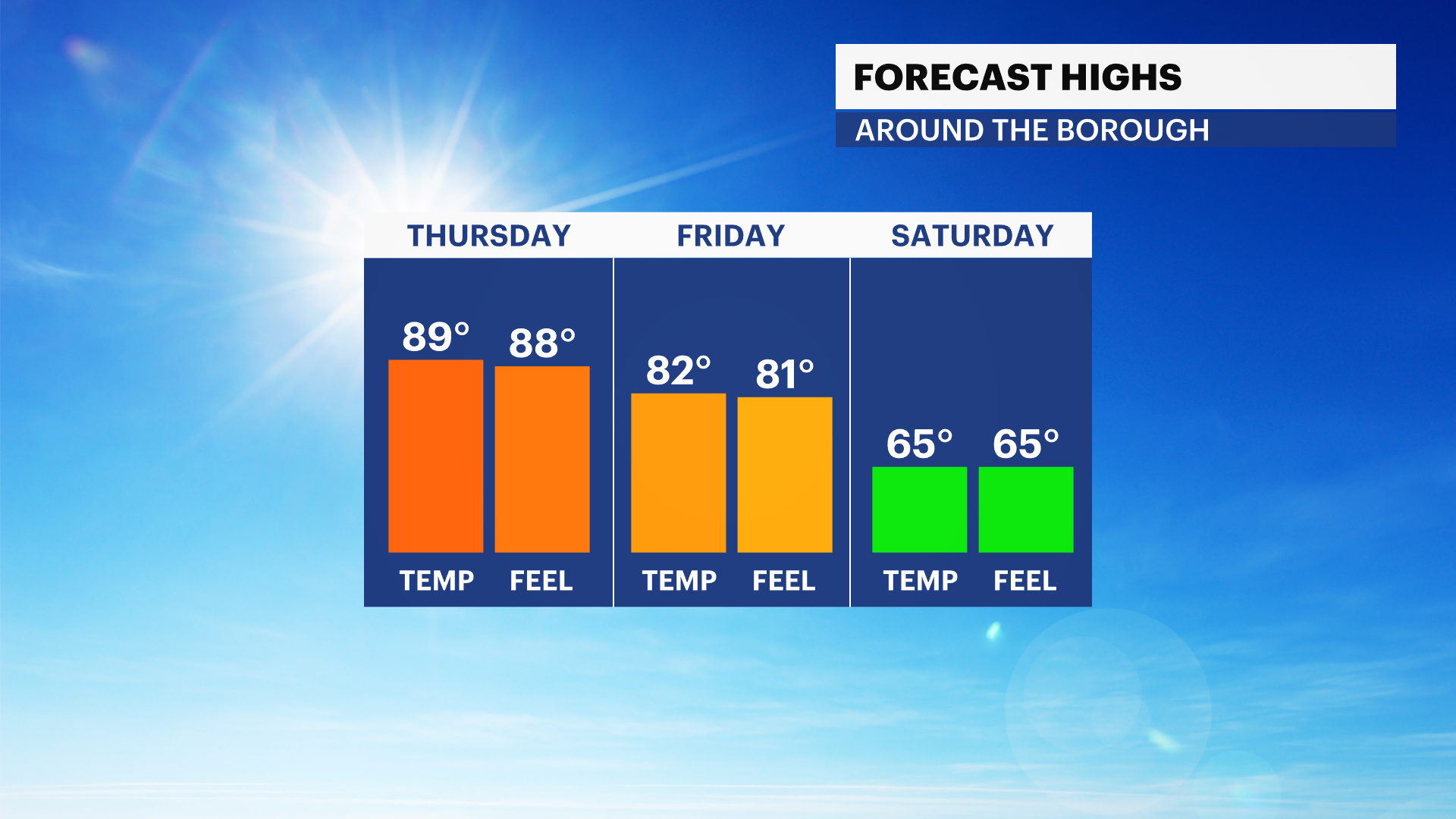 A significant cool‑down arrives this weekend and continues into next week. Temperatures will fall into the upper 60s—still above average—but a strong cold front on Sunday may trigger gusty storms. After that, we settle into a more around and below seasonable pattern next week, with cooler, breezy days in the 50s and 60s.